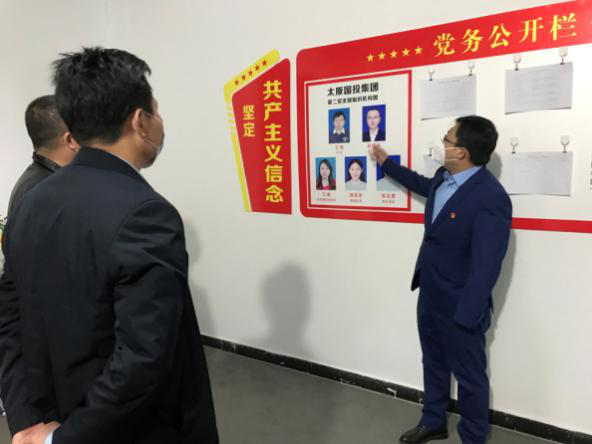 3月3日上午,市政府辦公室第九黨支部書記李曉光、副書記魏興旗、組織委員靳曉云一行三人蒞臨晉陽湖招商中心,對太原國投集團第二黨支部標準化建設情況進行觀摩交流。第二支部書記王棟、支部委員、集團黨委辦公室副主任耿麗君等同志陪同。