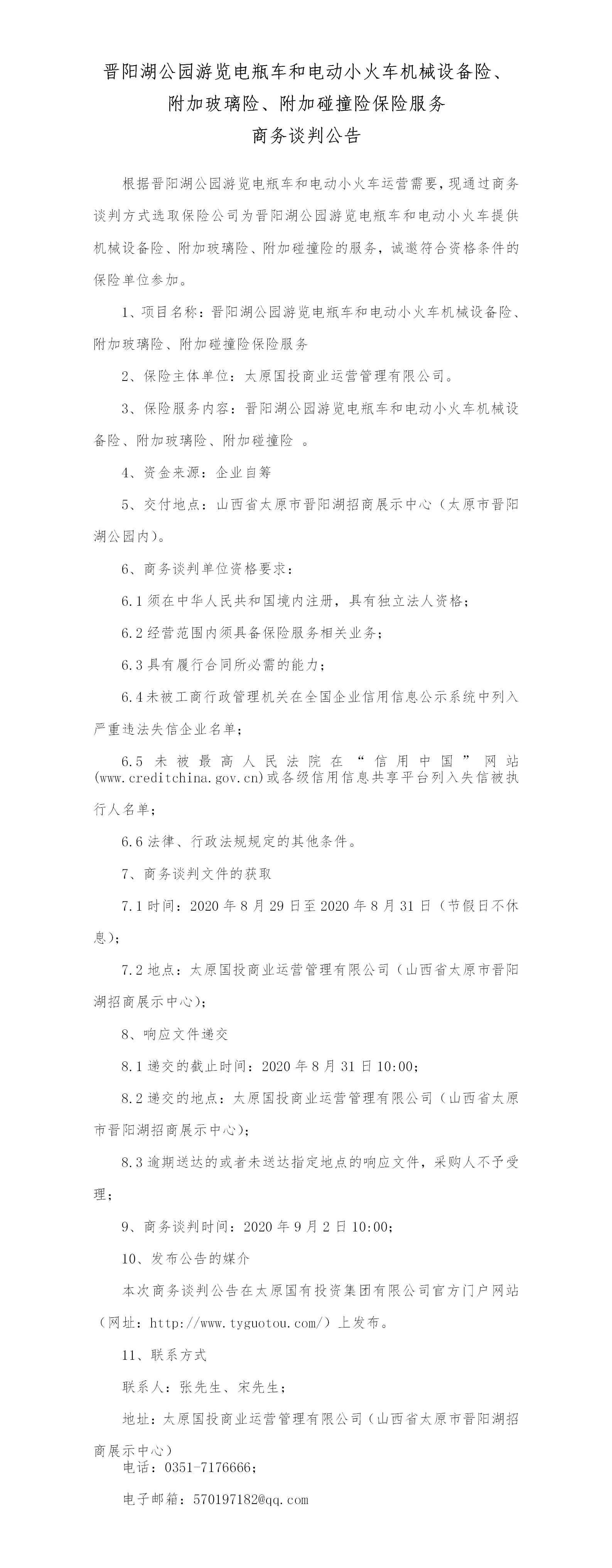 晉陽(yáng)湖公園游覽電瓶車和電動(dòng)小火車機(jī)械設(shè)備險(xiǎn)、附加玻璃險(xiǎn)、附加碰撞險(xiǎn)保險(xiǎn)服務(wù)商務(wù)談判公告
