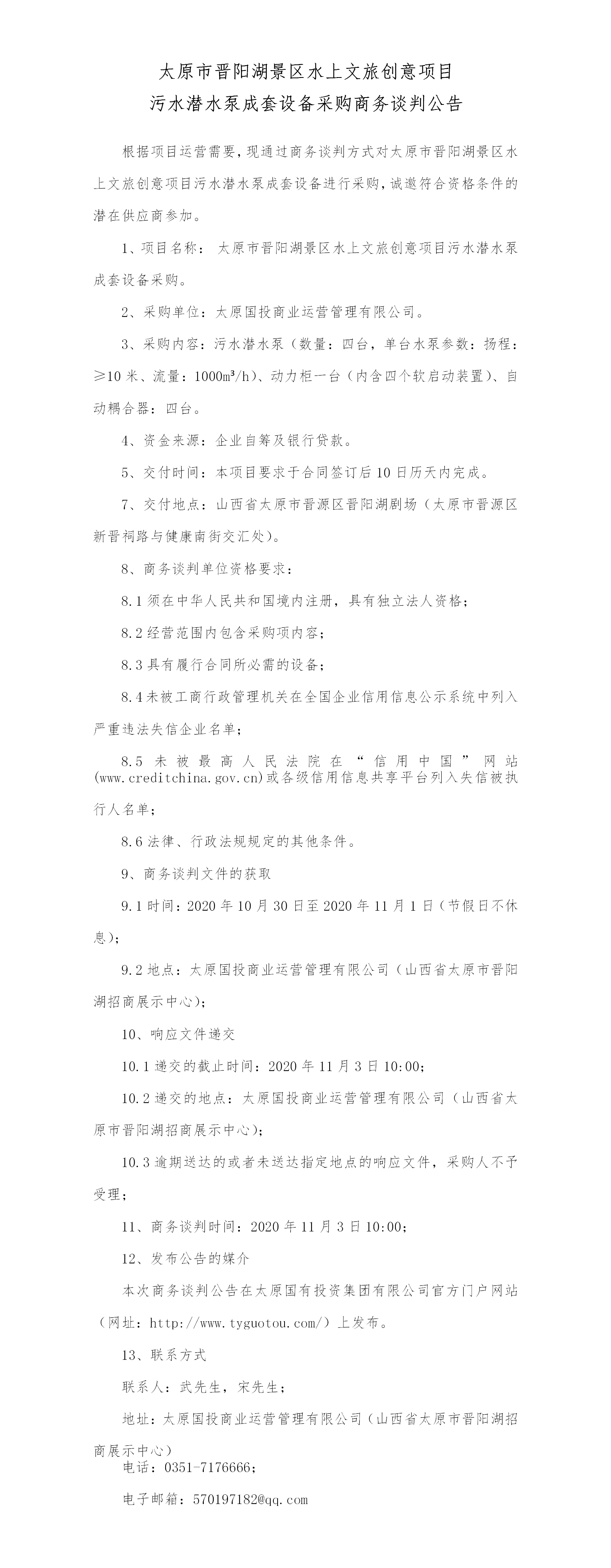太原市晉陽湖景區(qū)水上文旅創(chuàng)意項目污水潛水泵成套設(shè)備采購商務(wù)談判公告
