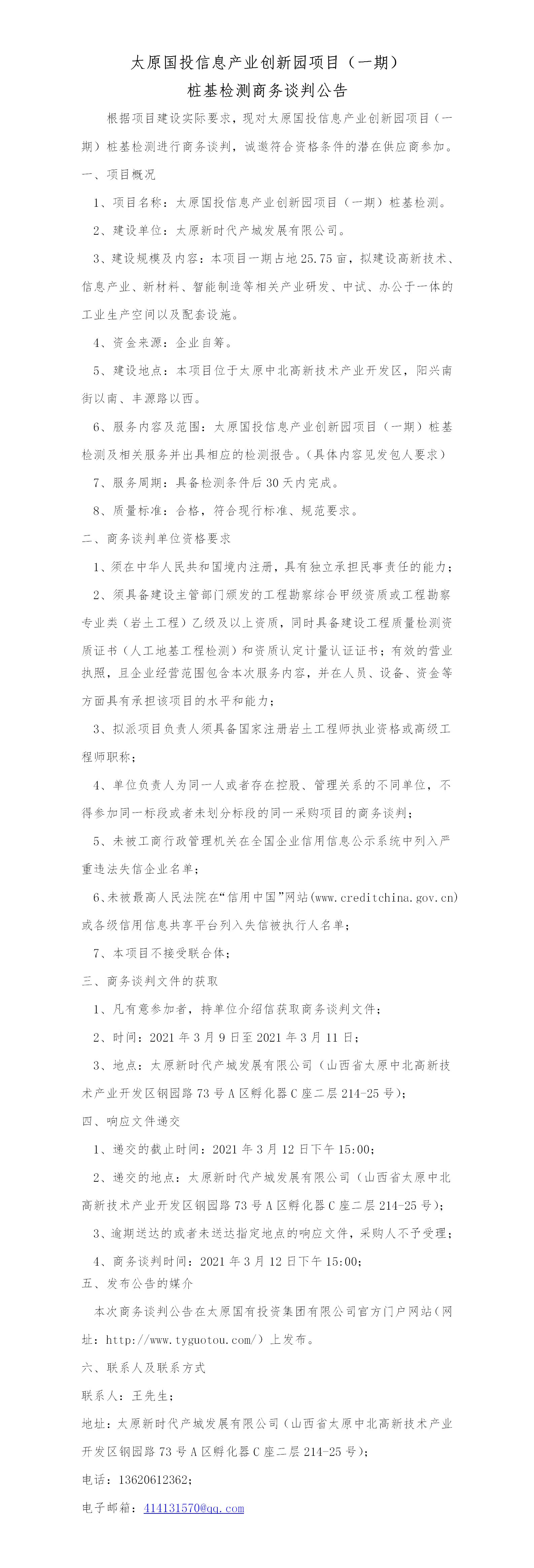 太原國投信息產(chǎn)業(yè)創(chuàng)新園項目(一期)樁基檢測商務(wù)談判公告
