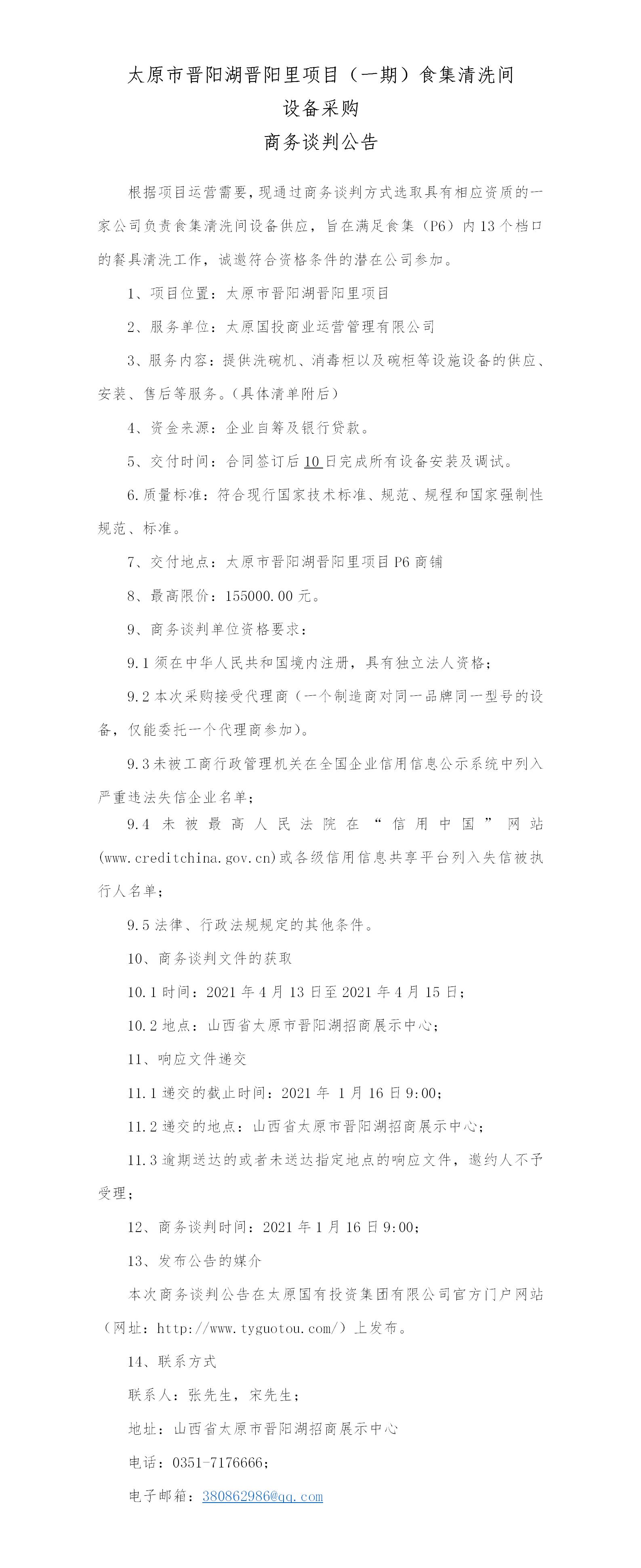 太原市晉陽(yáng)湖晉陽(yáng)里項(xiàng)目(一期)食集清洗間商務(wù)談判公告
