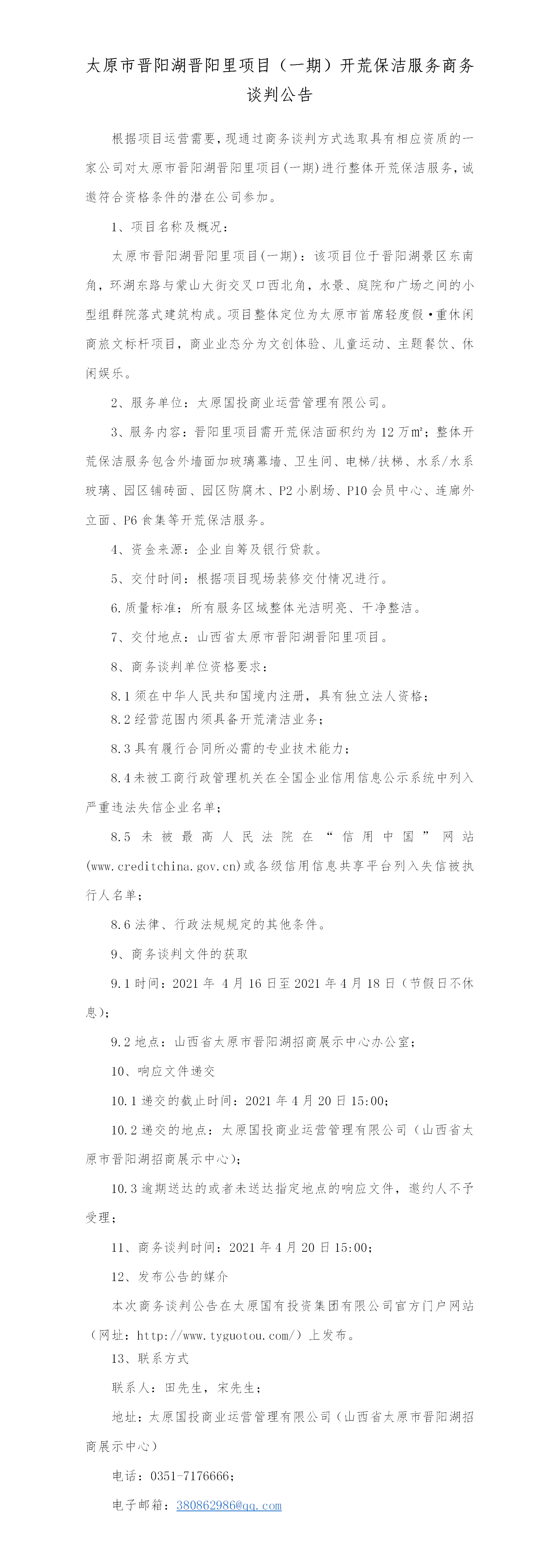 太原市晉陽湖晉陽里項目(一期)開荒保潔服務商務談判公告