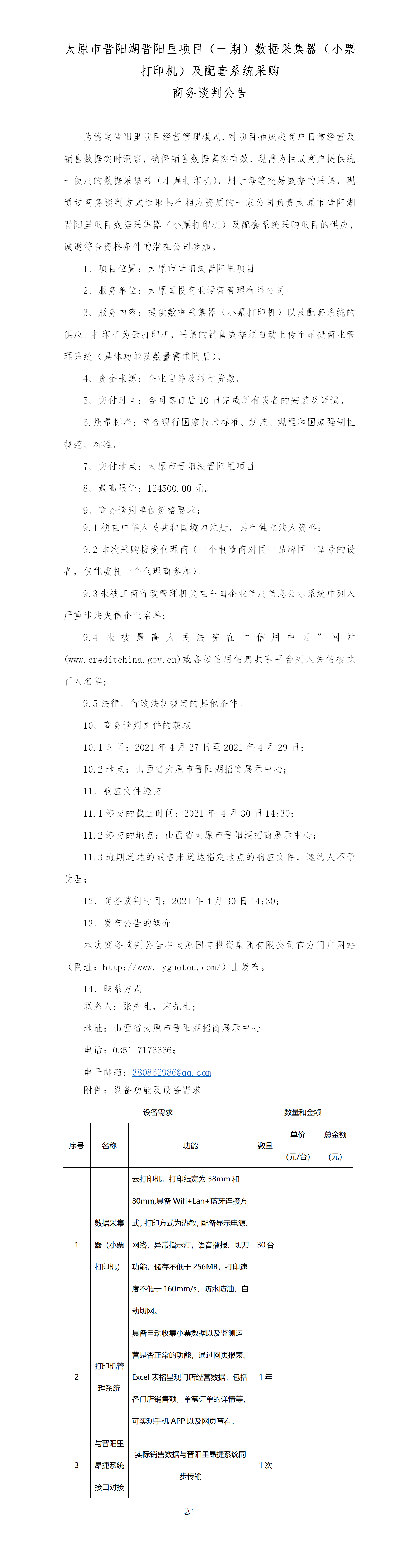 太原市晉陽湖晉陽里項目(一期)數(shù)據(jù)采集器(小票打印機)及配套系統(tǒng)采購項目