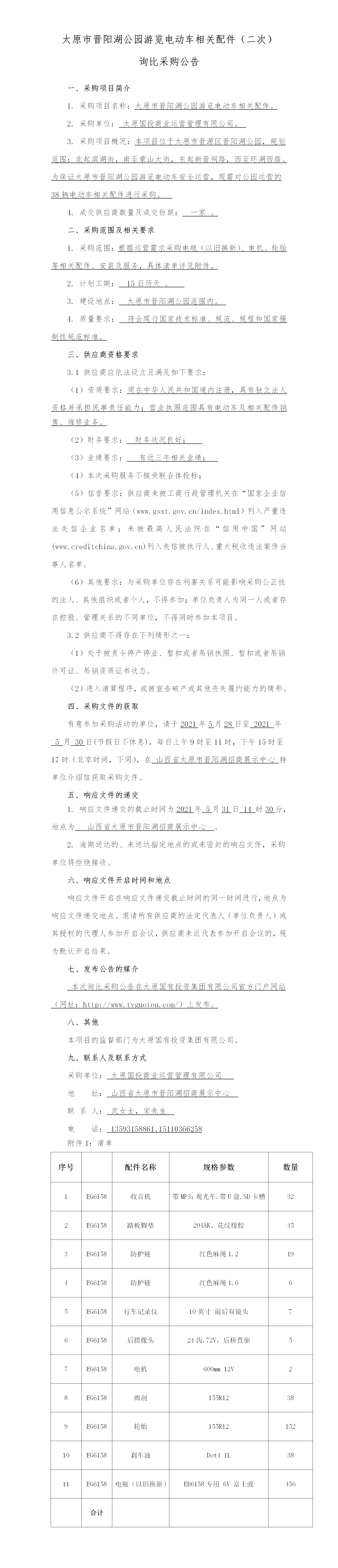 太原市晉陽湖公園游覽電動車相關(guān)配件詢比采購公告