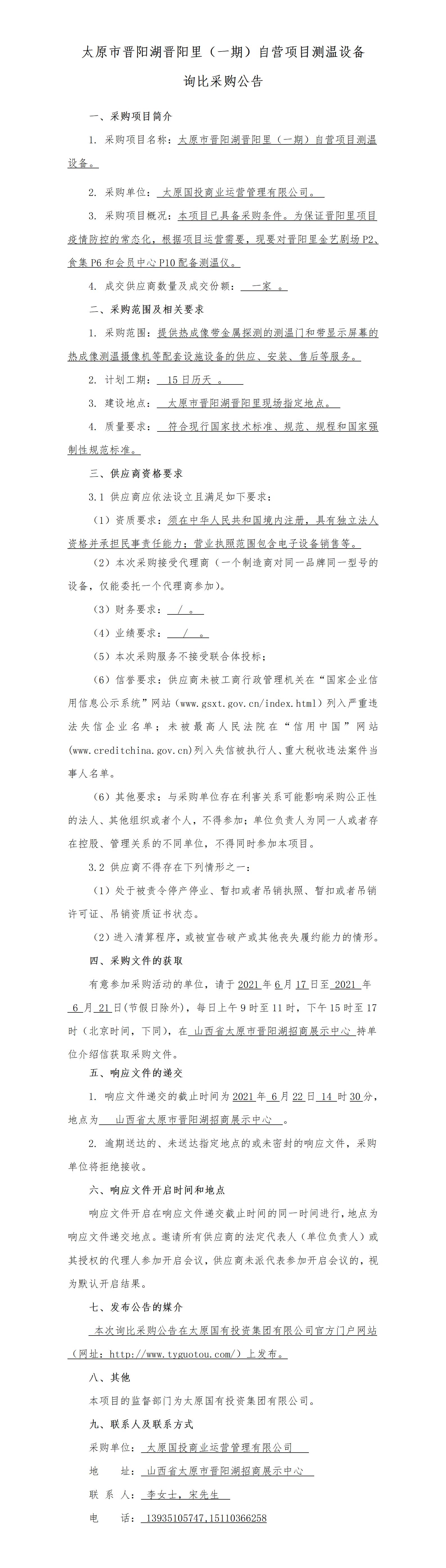 太原市晉陽(yáng)湖晉陽(yáng)里(一期)自營(yíng)項(xiàng)目測(cè)溫設(shè)備詢比采購(gòu)公告