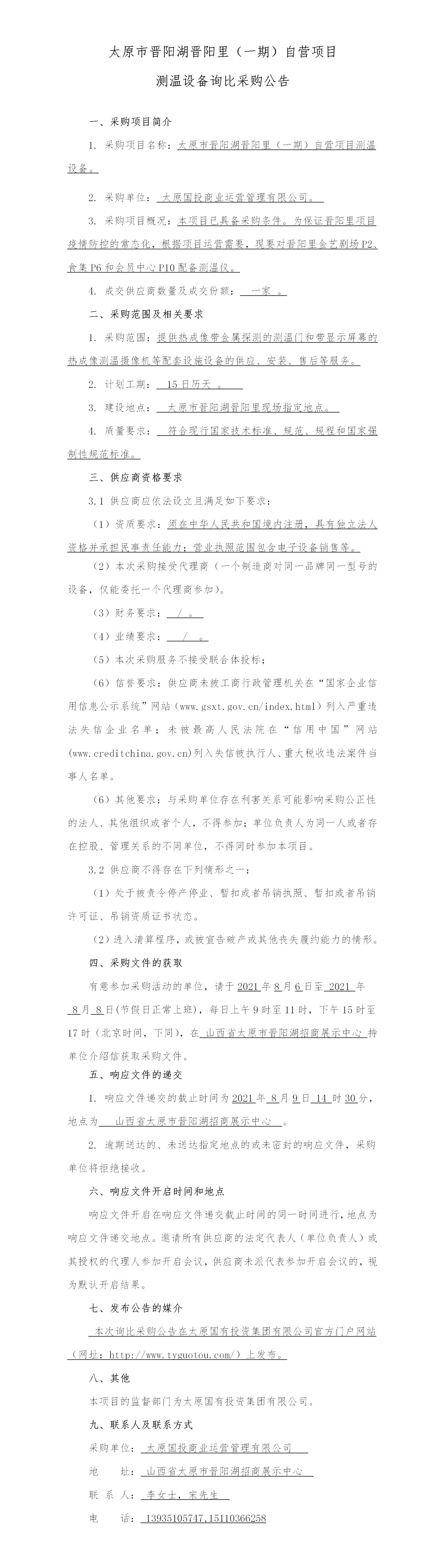 太原市晉陽湖晉陽里(一期)自營項目測溫設(shè)備詢比采購公告