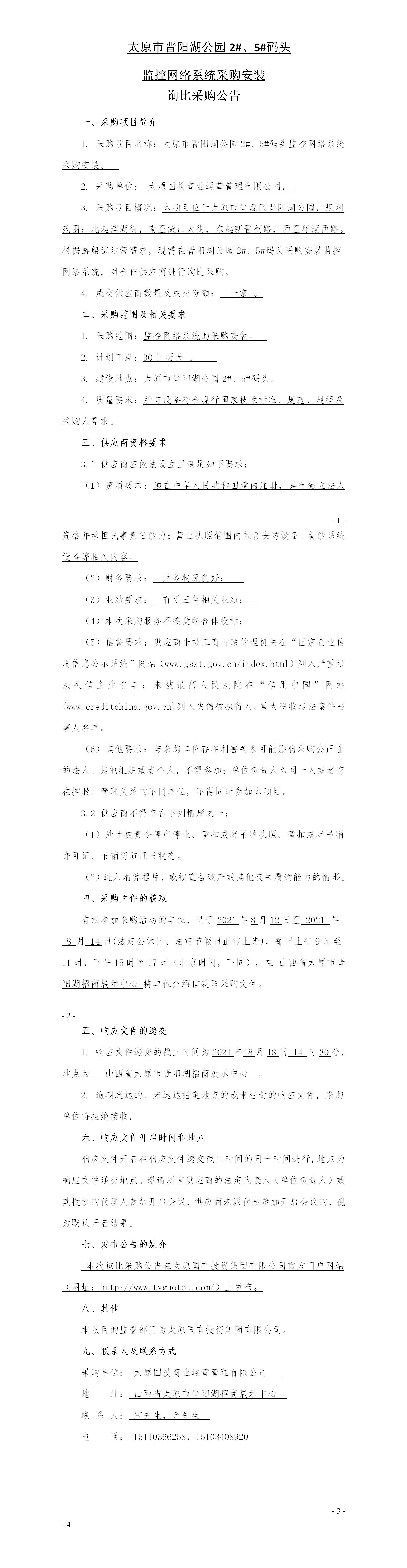 太原市晉陽湖公園2#、5#碼頭監(jiān)控網(wǎng)絡(luò)系統(tǒng)采購 公告