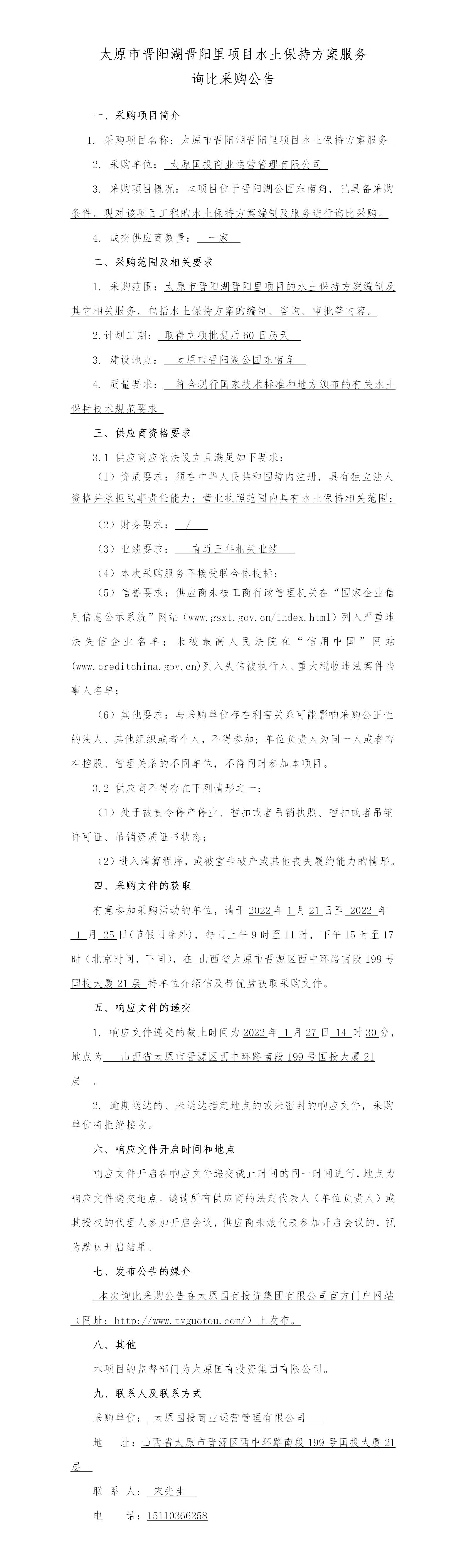 太原市晉陽湖晉陽里項目水土保持方案服務詢比采購公告