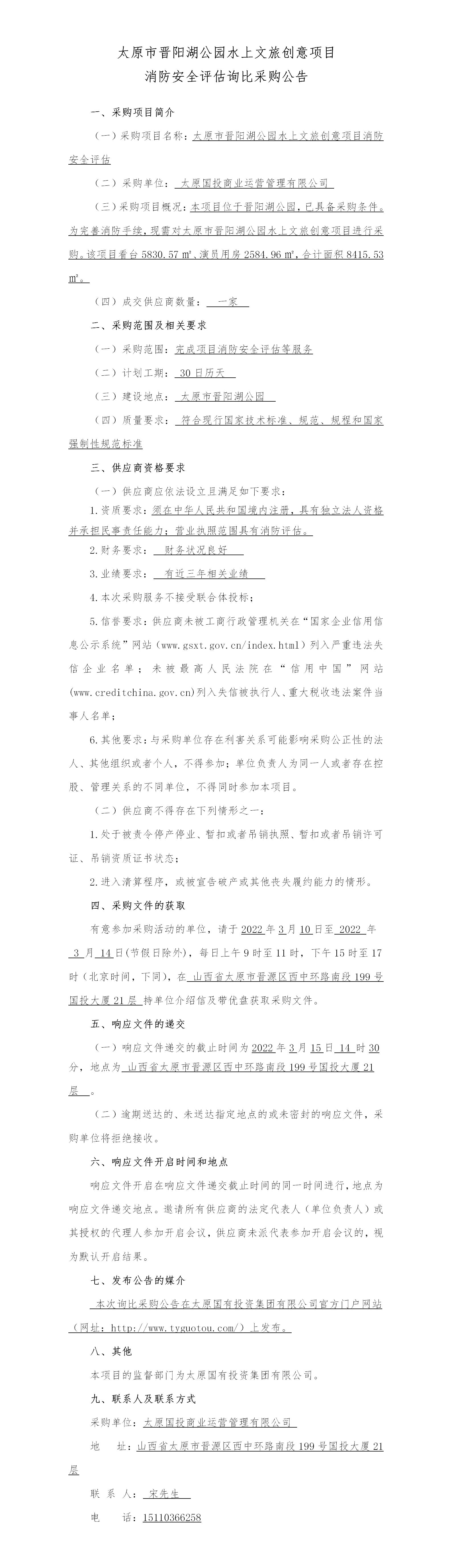 太原市晉陽湖公園水上文旅創(chuàng)意項(xiàng)目消防安全評(píng)估詢比采購公告