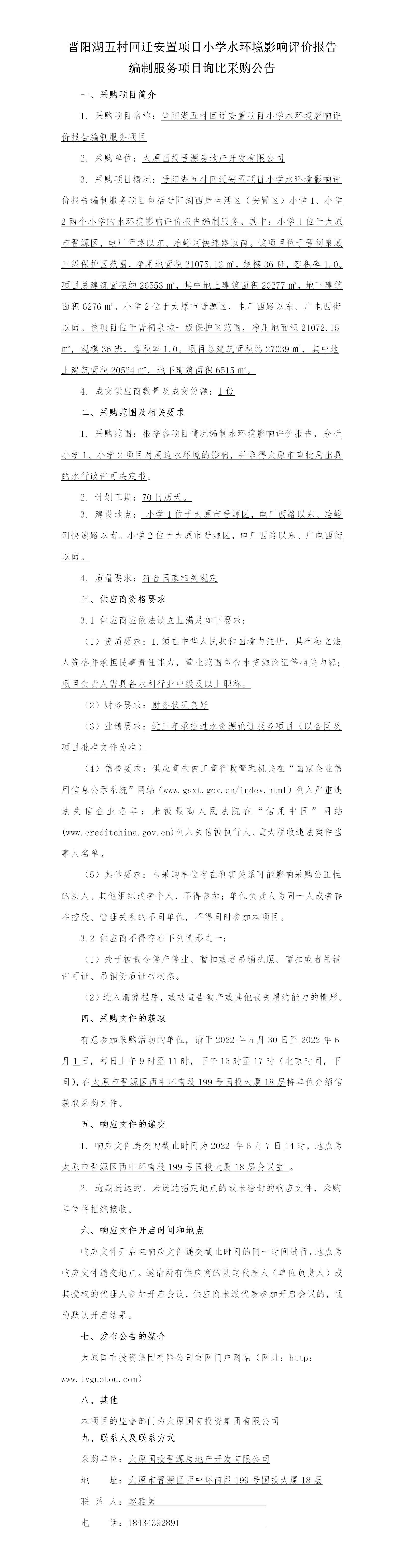 晉陽湖五村回遷安置項目小學水環(huán)境影響評價報告編制服務項目詢比采購公告
