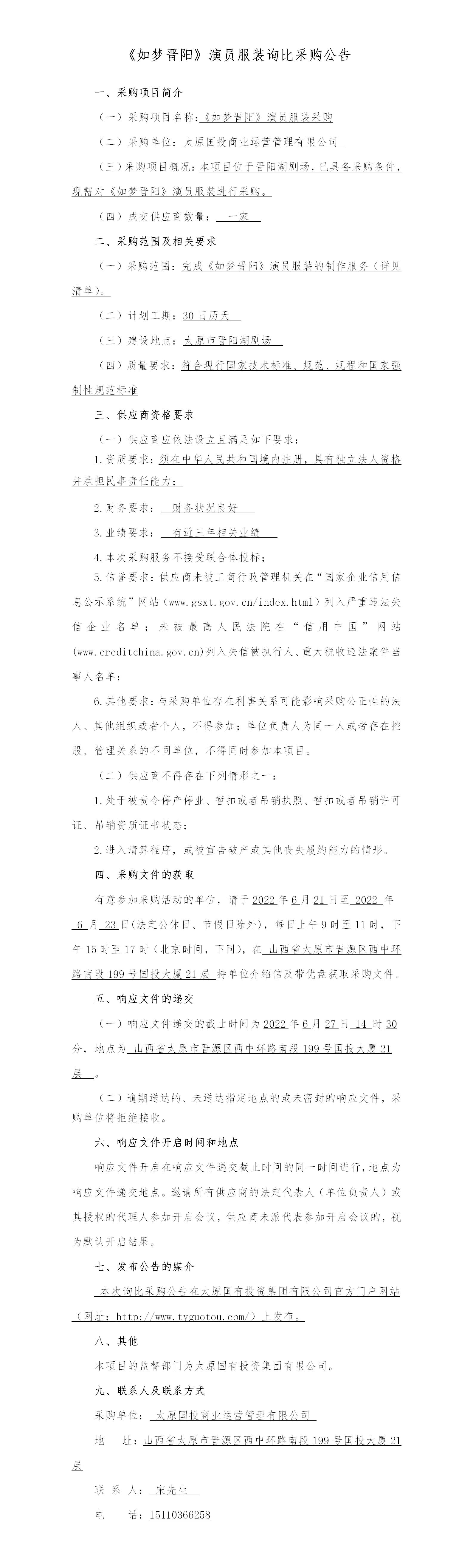 《如夢晉陽》演員服裝詢比采購公告