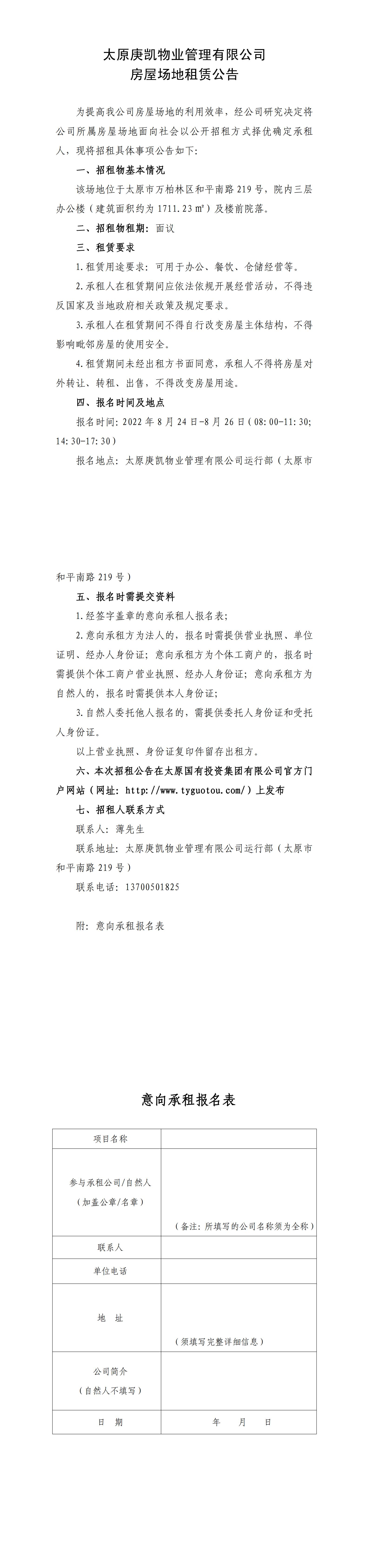 太原庚凱物業(yè)管理有限公司房屋場地租賃公告