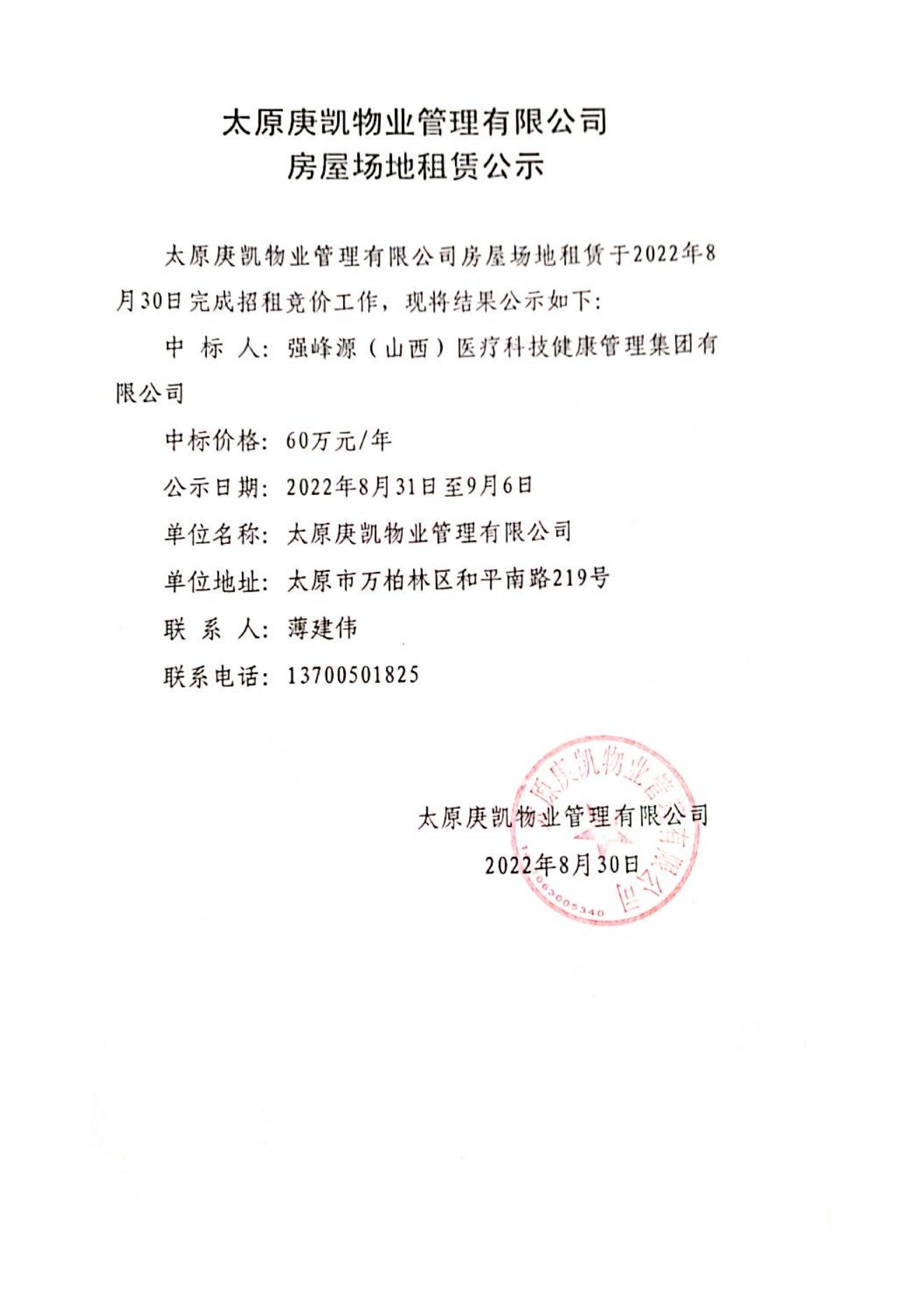 太原庚凱物業(yè)管理有限公司房屋場地租賃公示