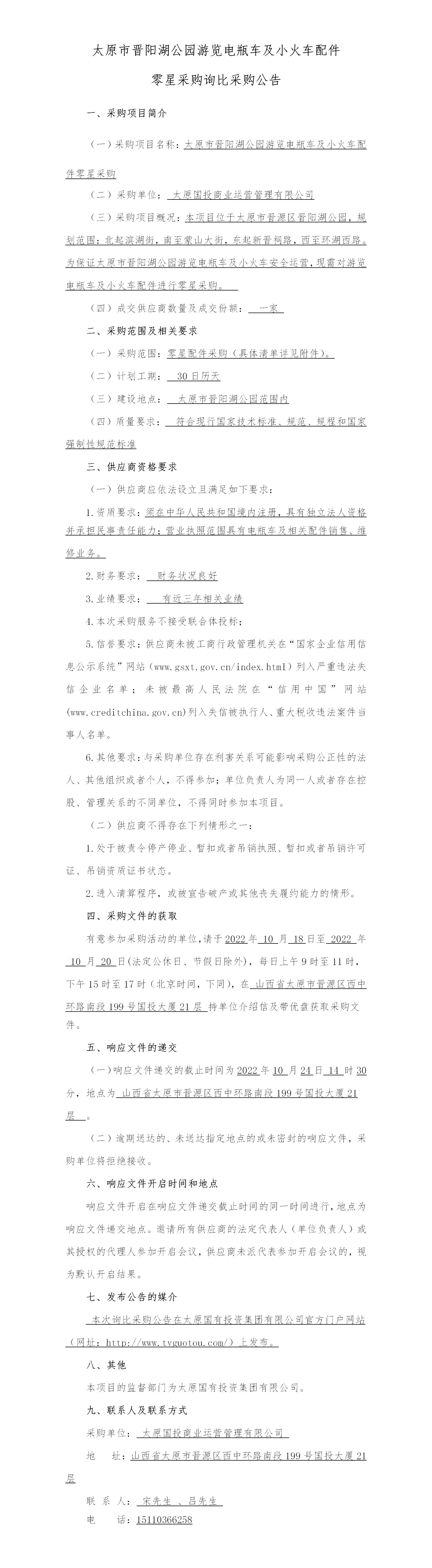 太原市晉陽(yáng)湖公園游覽電瓶車及小火車配件零星采購(gòu)詢比采購(gòu)公告