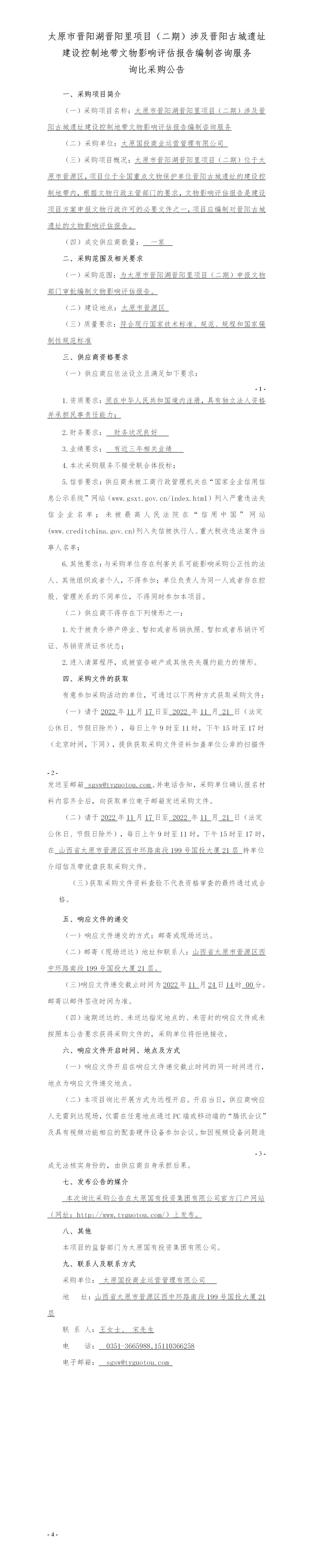 太原市晉陽(yáng)湖晉陽(yáng)里項(xiàng)目(二期)涉及晉陽(yáng)古城遺址建設(shè)控制地帶文物影響評(píng)估報(bào)告編制咨詢服務(wù)詢比采購(gòu)公告