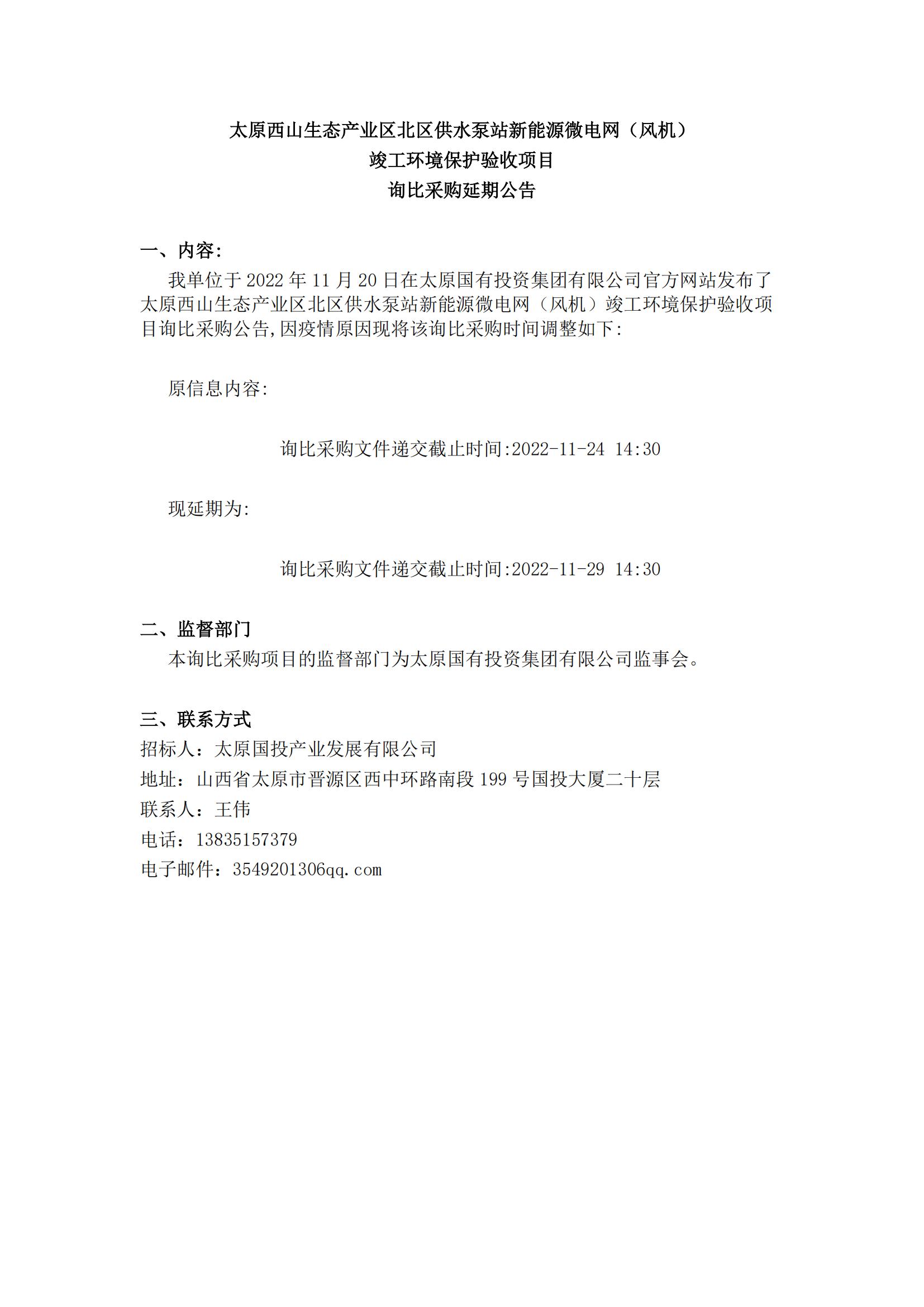 太原西山生態(tài)產(chǎn)業(yè)區(qū)北區(qū)供水泵站新能源微電網(wǎng)風(fēng)機(jī)竣工環(huán)境保護(hù)驗(yàn)收詢比采購延期公告