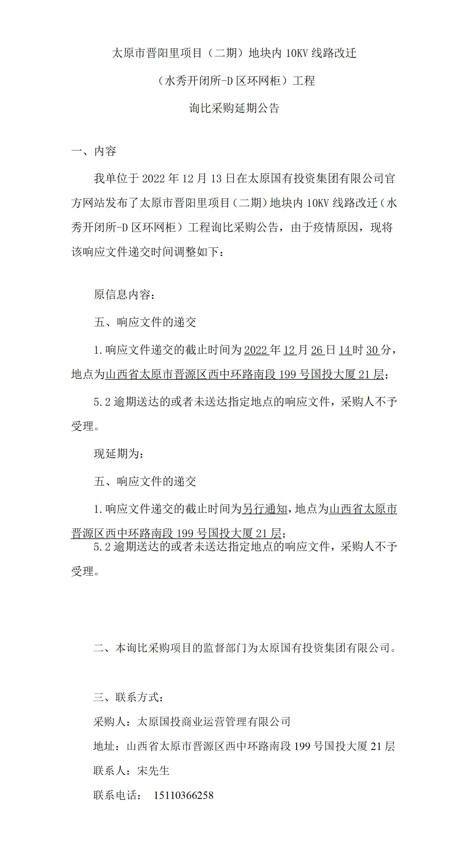 太原市晉陽里項目(二期)地塊內(nèi)10KV線路改遷(水秀開閉所-D區(qū)環(huán)網(wǎng)柜)工程詢比采購延期公告