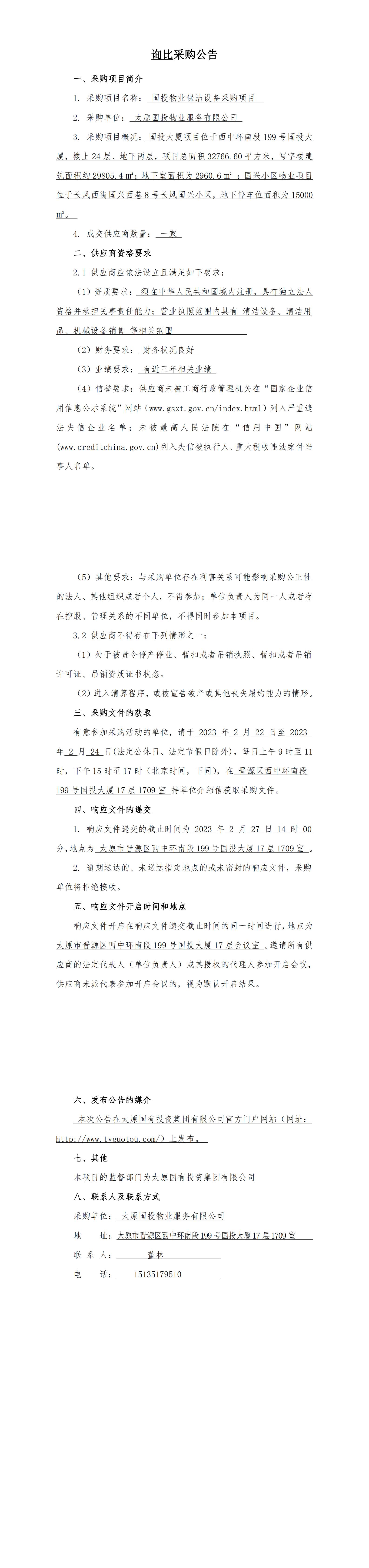 太原國投物業(yè)保潔設(shè)備采購項目詢比采購公告