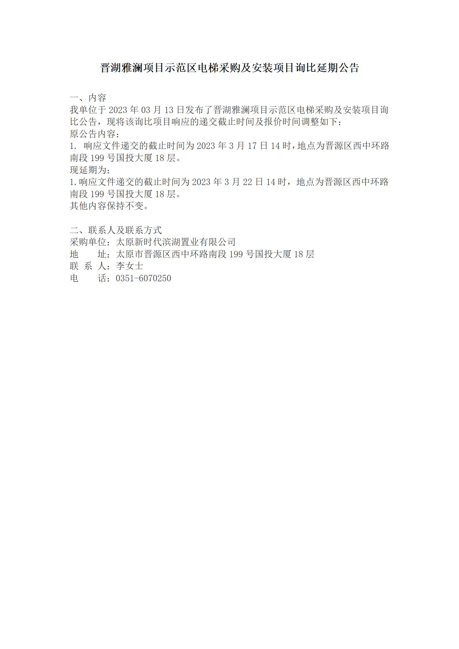 晉湖雅瀾項目示范區(qū)電梯采購及安裝項目詢比延期公告