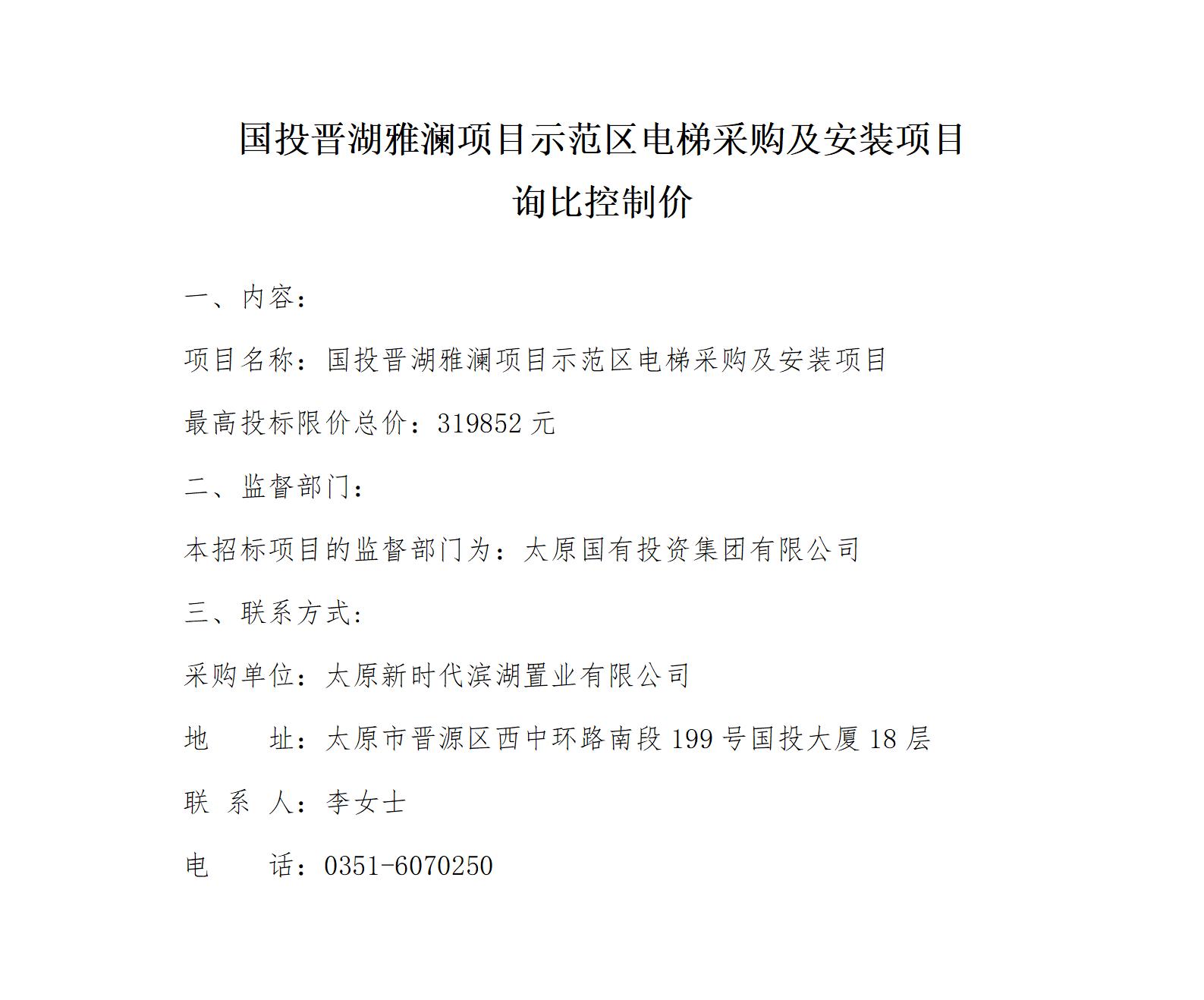 晉湖雅瀾項目示范區(qū)電梯采購及安裝項目詢比控制價
