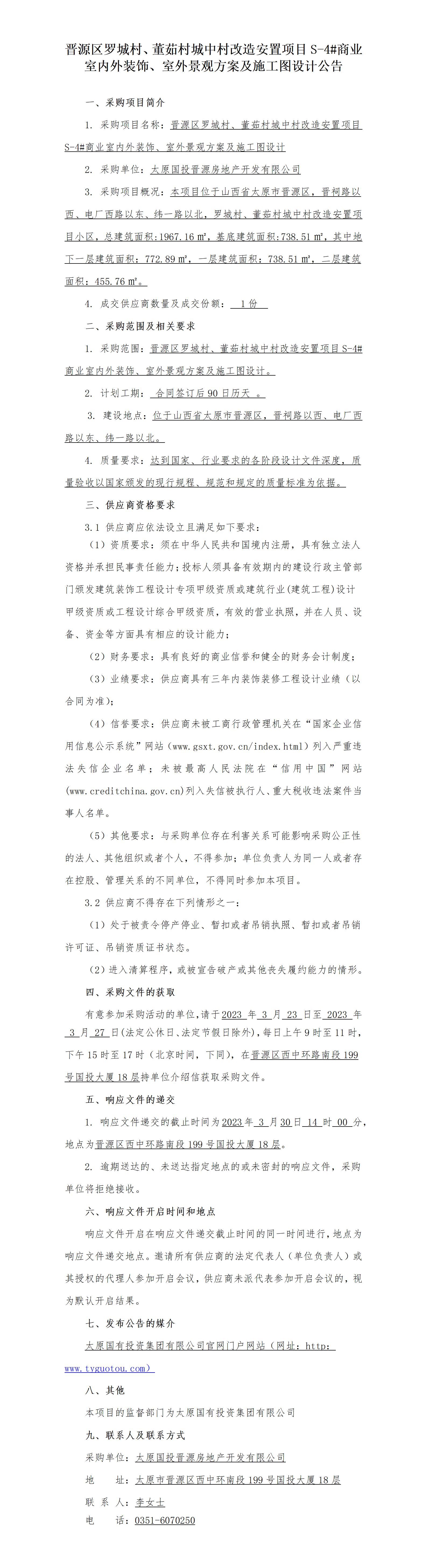晉源區(qū)羅城村、董茹村城中村改造安置項目S-4#商業(yè)室內(nèi)外裝飾、室外景觀方案及施工圖設(shè)計公告