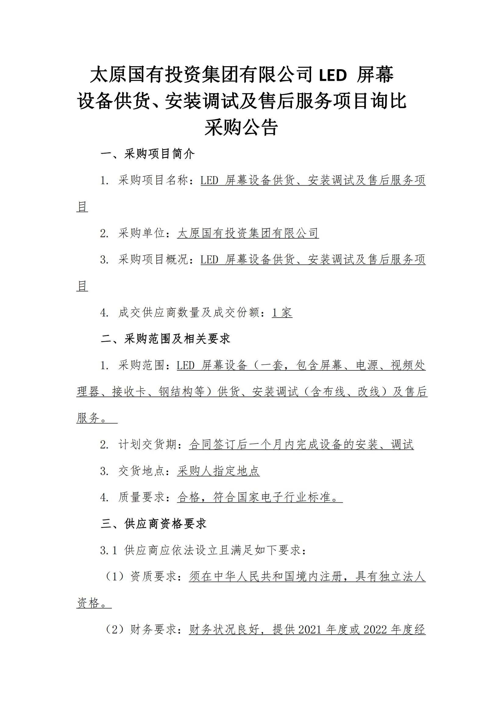 太原國有投資集團有限公司LED 屏幕 設(shè)備供貨、安裝調(diào)試及售后服務(wù)項目詢比采購公告