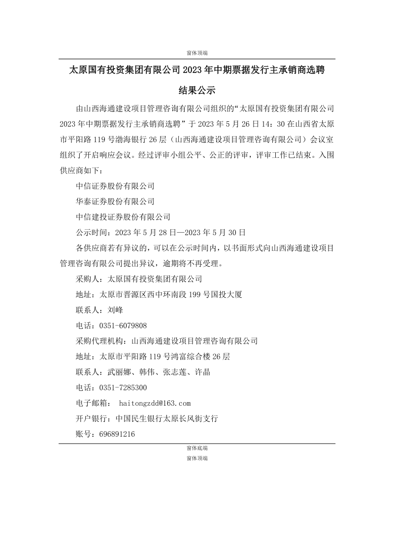 太原國(guó)有投資集團(tuán)有限公司2023年中期票據(jù)發(fā)行主承銷(xiāo)商選聘結(jié)果公示