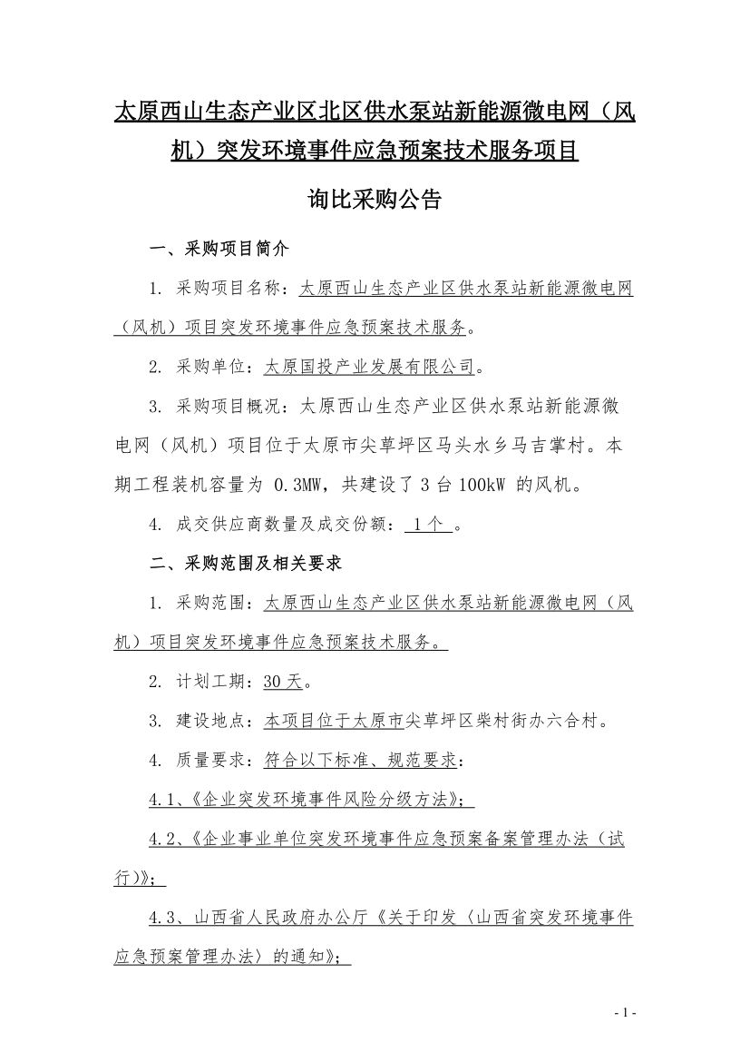 太原西山生態(tài)產(chǎn)業(yè)區(qū)北區(qū)供水泵站新能源微電網(wǎng)風(fēng)機(jī)突發(fā)環(huán)境事件應(yīng)急預(yù)案技術(shù)服務(wù)項(xiàng)目詢比采購公告