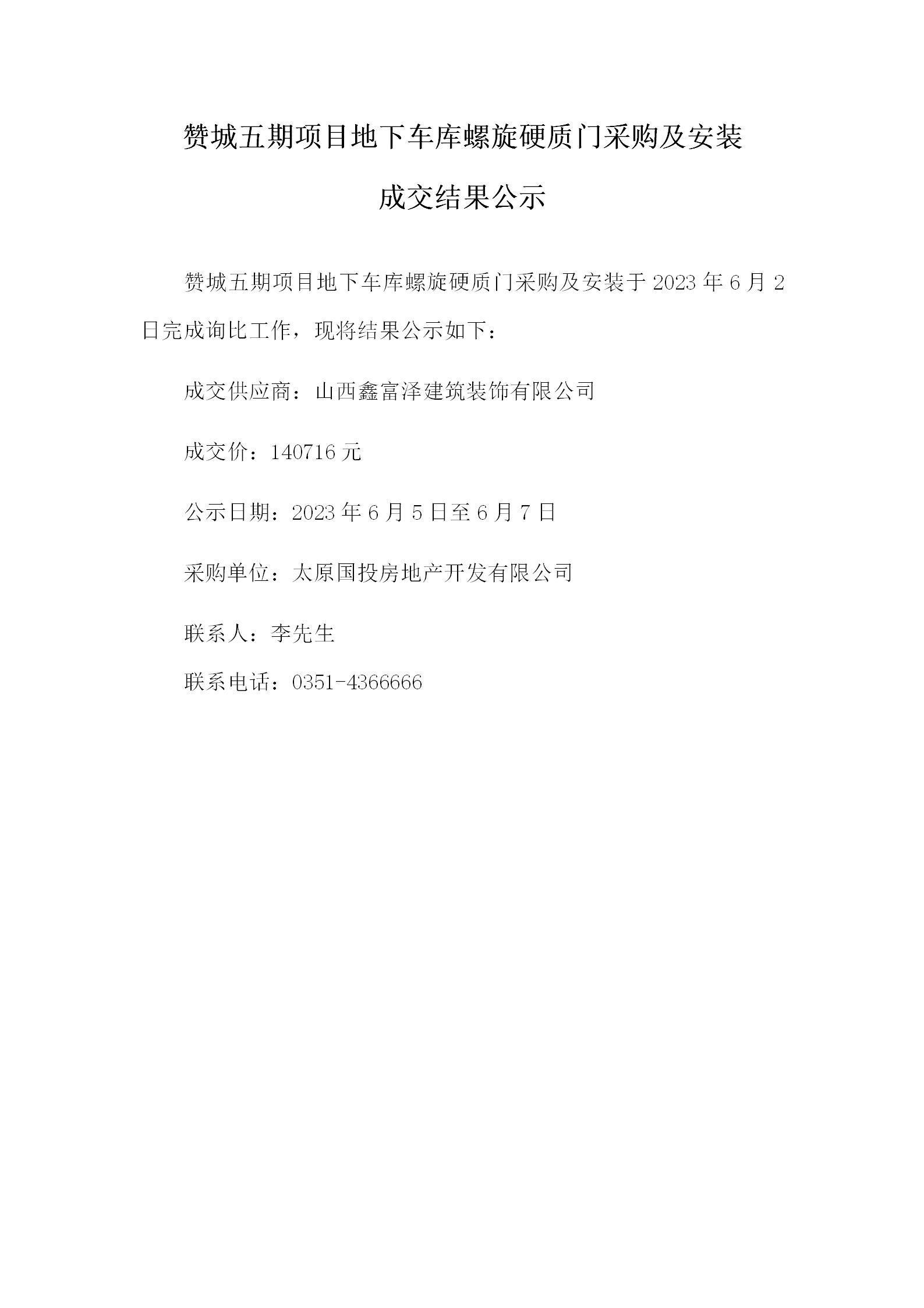 贊城五期項(xiàng)目地下車庫螺旋硬質(zhì)門采購及安裝成交結(jié)果公示