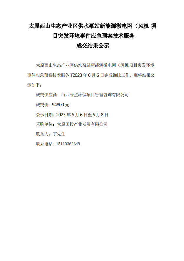 太原西山生態(tài)產(chǎn)業(yè)區(qū)供水泵站新能源微電網(wǎng)風(fēng)機(jī)項(xiàng)目突發(fā)環(huán)境事件應(yīng)急預(yù)案技術(shù)服務(wù)采購詢比成交結(jié)果公示