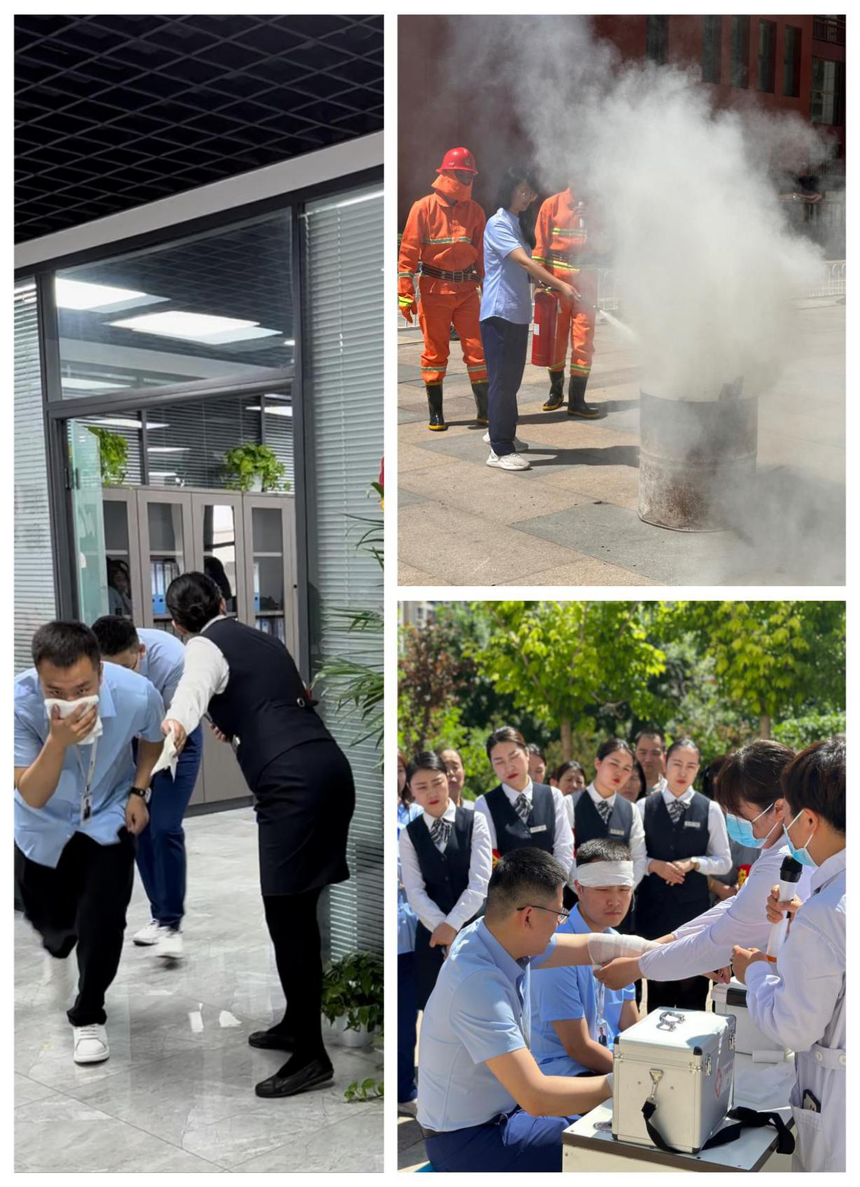此次演練在劉冰同志的動員講話中拉開序幕。從應急響應到人員搶撤,從火場警戒到滅火救火,從傷員包扎急救到經(jīng)驗總結,展開了高層建筑火場逃生演練。同時對滅火器、逃生面具等救援裝備使用方法進行了現(xiàn)場教學及實操演練,力求參訓人員能真切感受火場狀況、了解和掌握實戰(zhàn)技能。參訓人員面對火場臨危不懼、積極應對、同進同出、密切配合,圓滿完成了訓練任務。