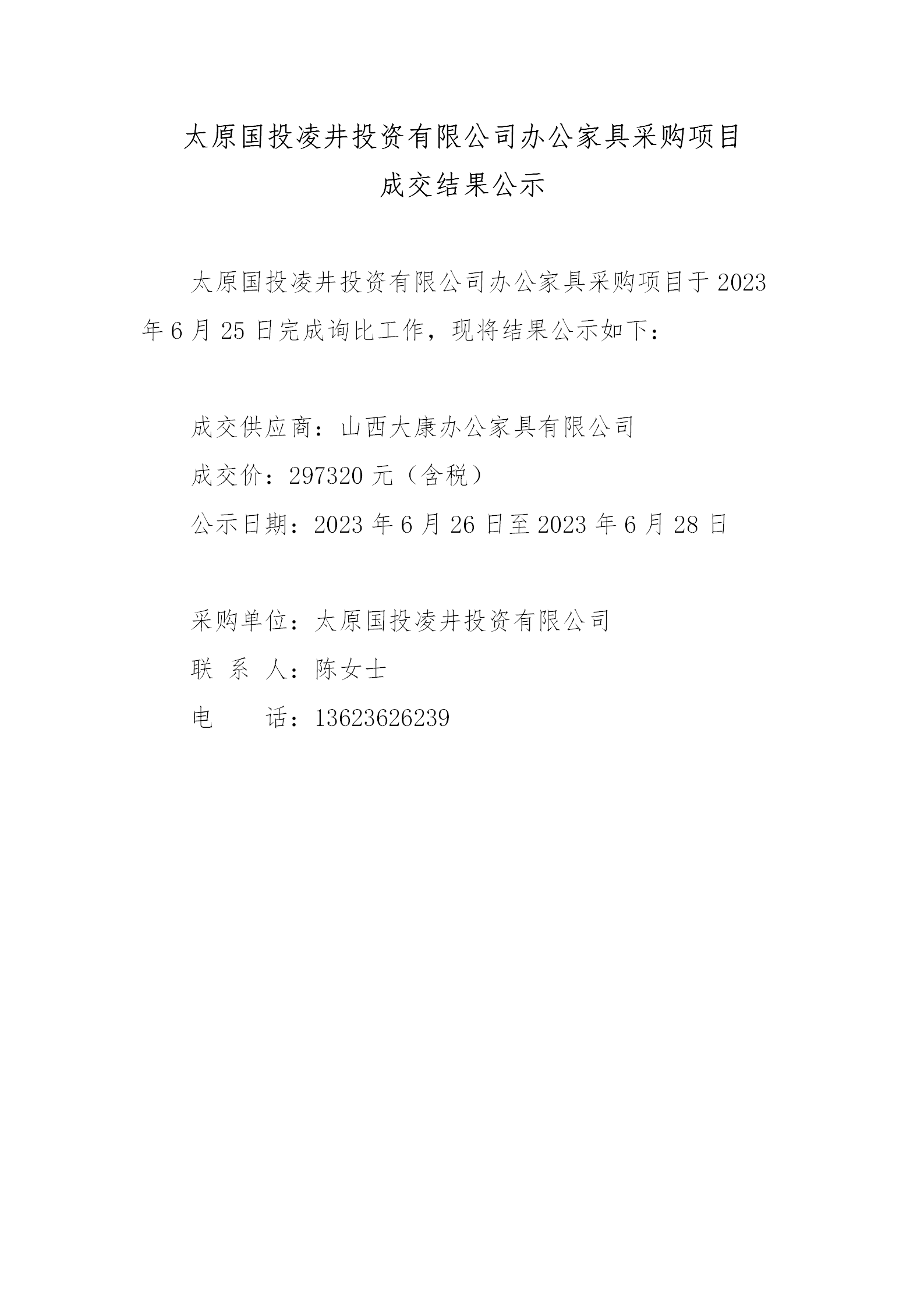 太原國投凌井投資有限公司辦公家具采購項目成交結果公示