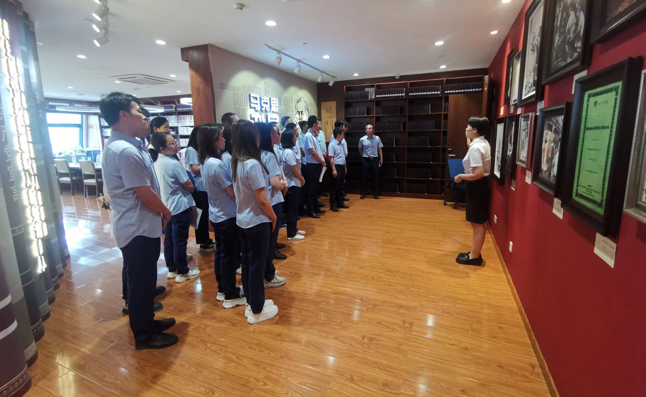 首先,全體人員在講解員的引導(dǎo)下,參觀了馬克思生平圖片展示區(qū)、馬克思著作藏書區(qū)、當(dāng)代馬克思主義的傳播區(qū)、習(xí)近平文獻(xiàn)專區(qū)等。在展示區(qū)懸掛有馬克思及其妻子燕妮的畫像,有馬克思17歲畢業(yè)時(shí)的論文《青年在選擇職業(yè)時(shí)的考慮》手稿,有馬克思與朋友在曼徹斯特暢談的畫面,有馬克思與他的三個(gè)女兒的全家福,還有馬克思一生摯友恩格斯的身影……通過講解員對這37幅畫卷的講解,使大家進(jìn)一步了解了馬克思的生平以及馬克思主義產(chǎn)生的社會歷史背景,近距離感知馬克思主義的精髓,穿越百年體味這位時(shí)代偉人的一生。