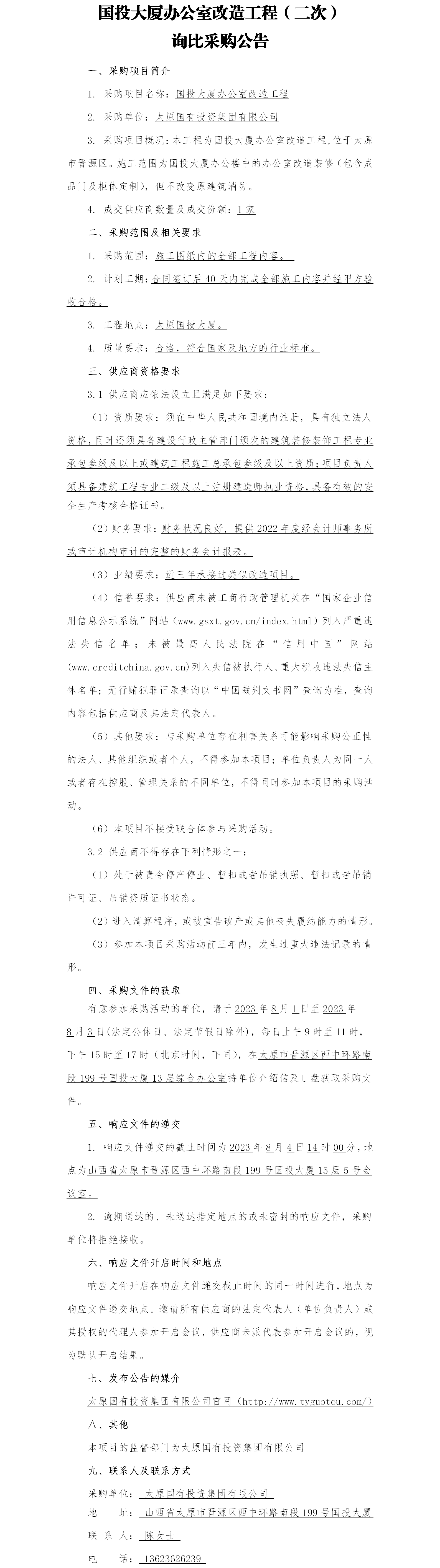 國(guó)投大廈辦公室改造工程(二次) 詢比采購(gòu)公告