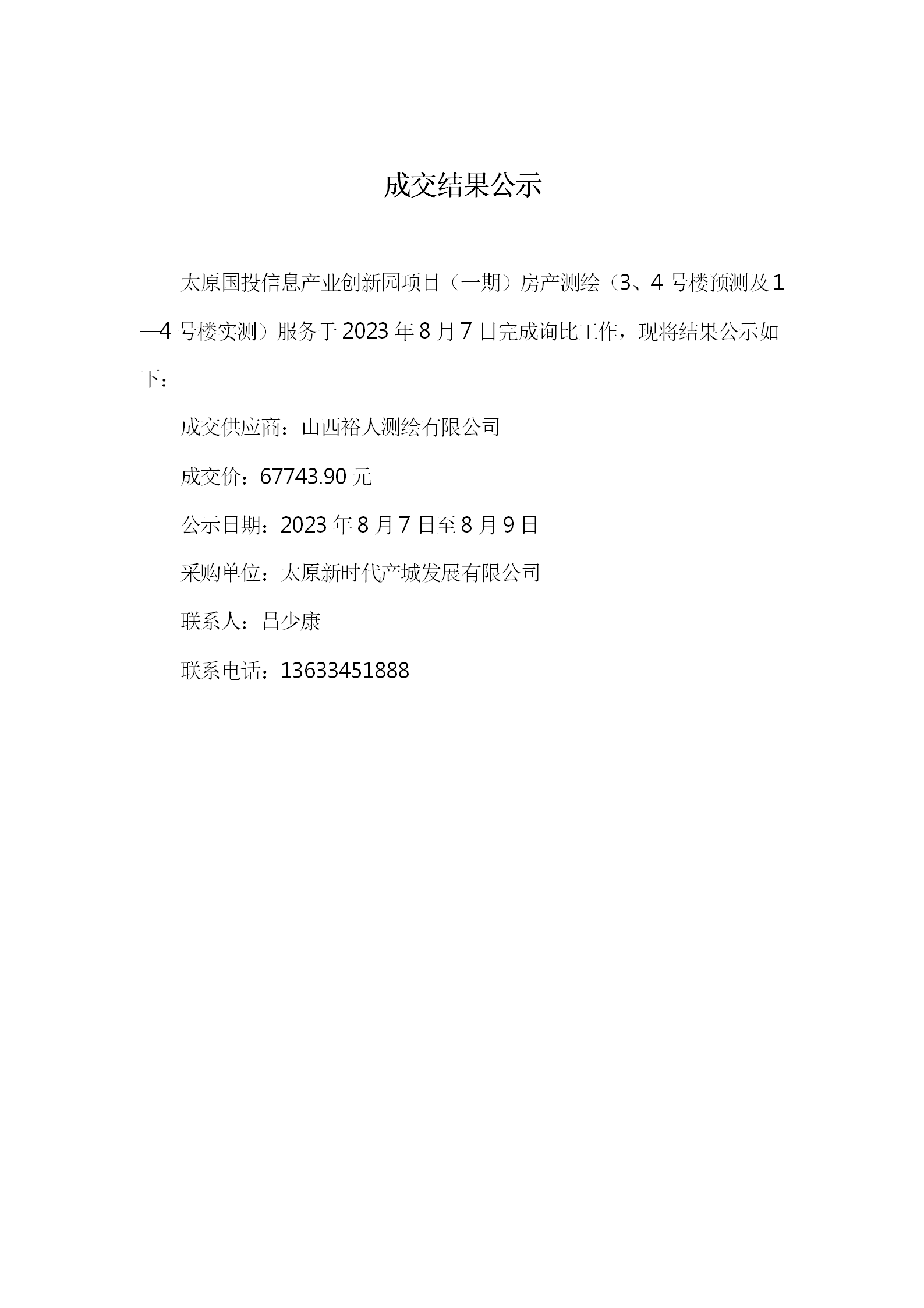 太原國(guó)投信息產(chǎn)業(yè)創(chuàng)新園項(xiàng)目(一期)房產(chǎn)測(cè)繪(3、4號(hào)樓預(yù)測(cè)及1-4號(hào)樓實(shí)測(cè))服務(wù)采購(gòu)詢比成交結(jié)果公示