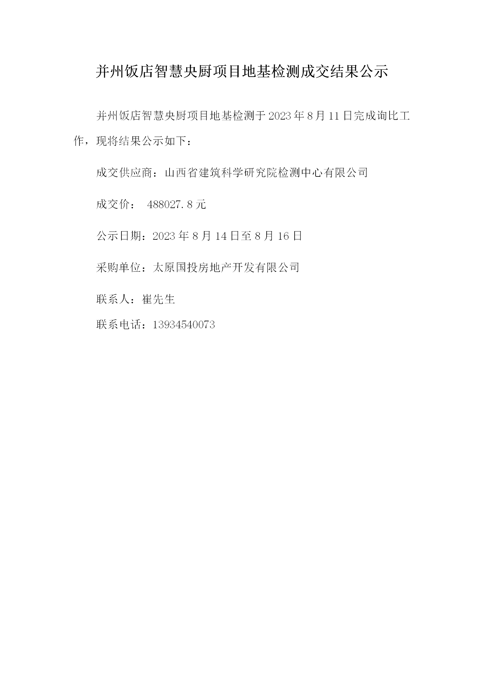 并州飯店智慧央廚項目地基檢測成交結(jié)果公示