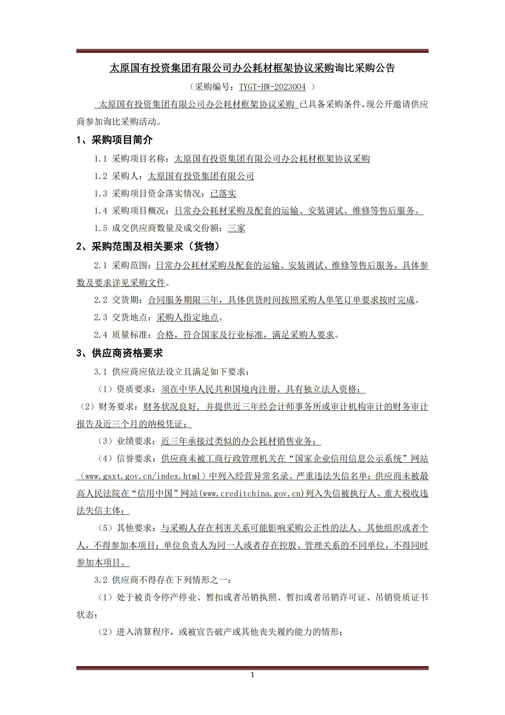 太原國(guó)有投資集團(tuán)有限公司辦公耗材采購(gòu)詢比公告