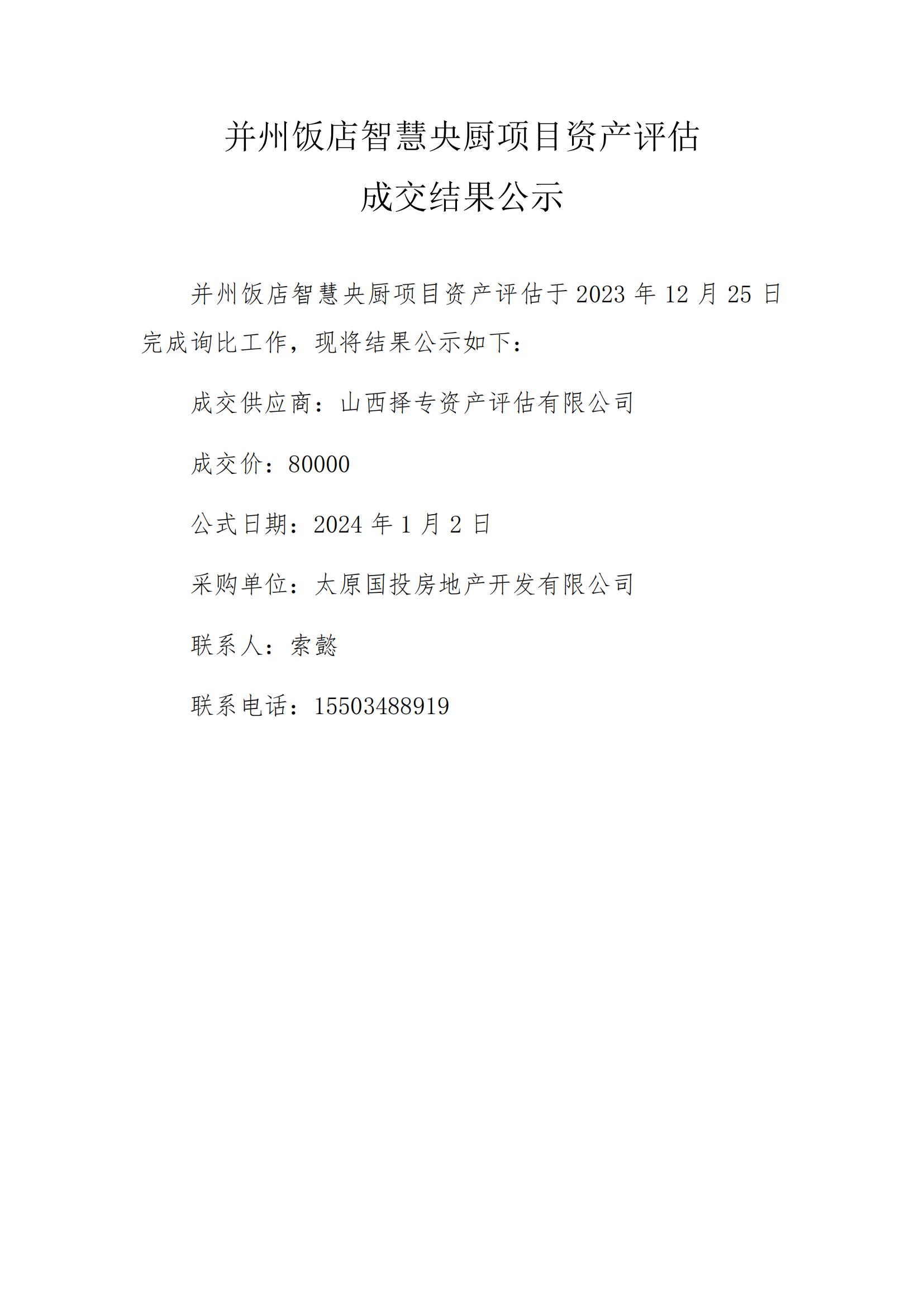 并州飯店智慧央廚項目資產(chǎn)評估成交結(jié)果公示