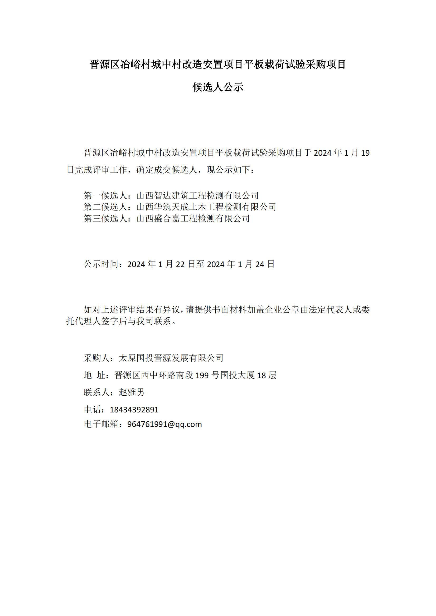 晉源區(qū)冶峪村城中村改造安置項目平板載荷試驗候選人公示