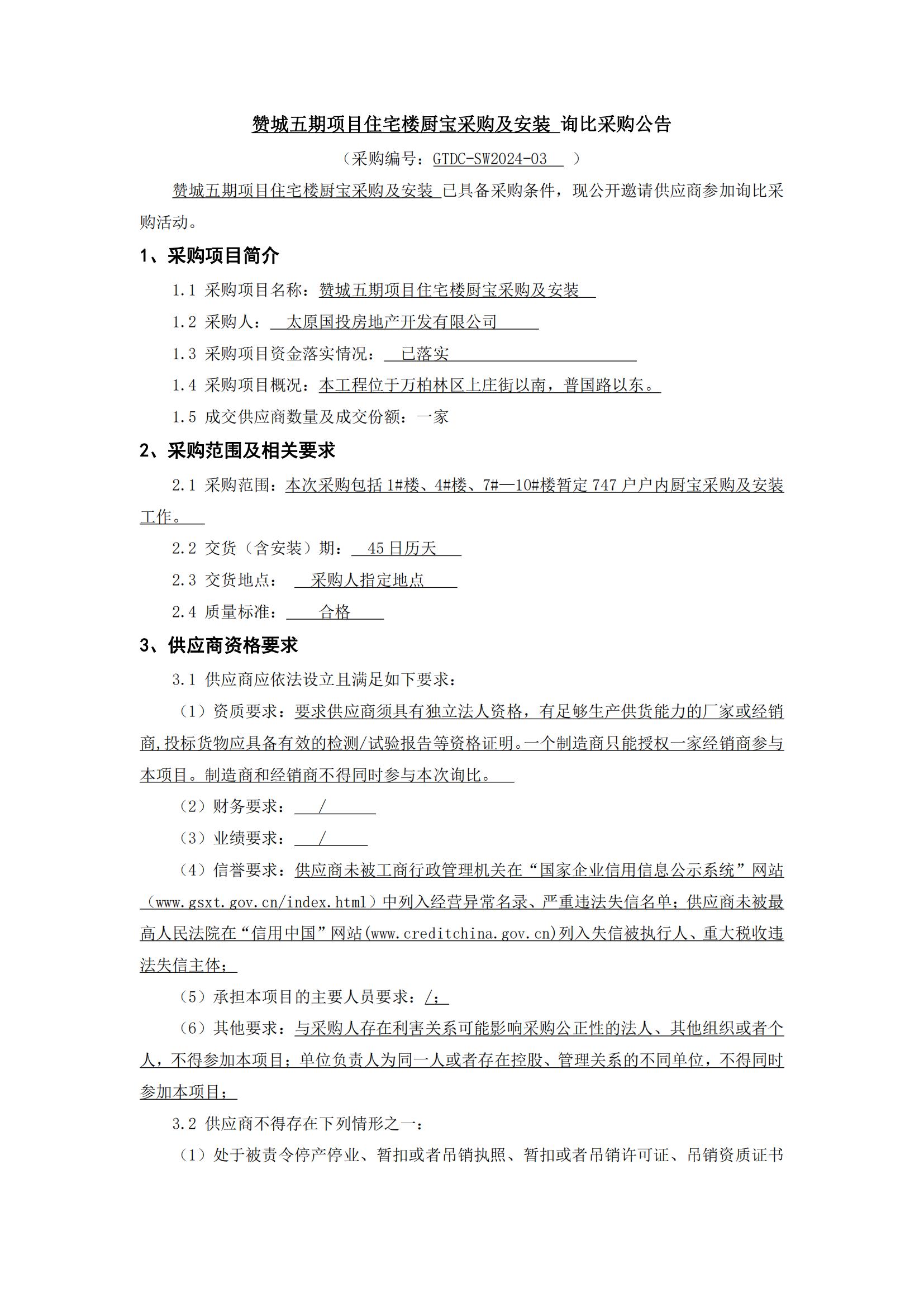 贊城五期項(xiàng)目住宅樓廚寶采購及安裝詢比采購公告