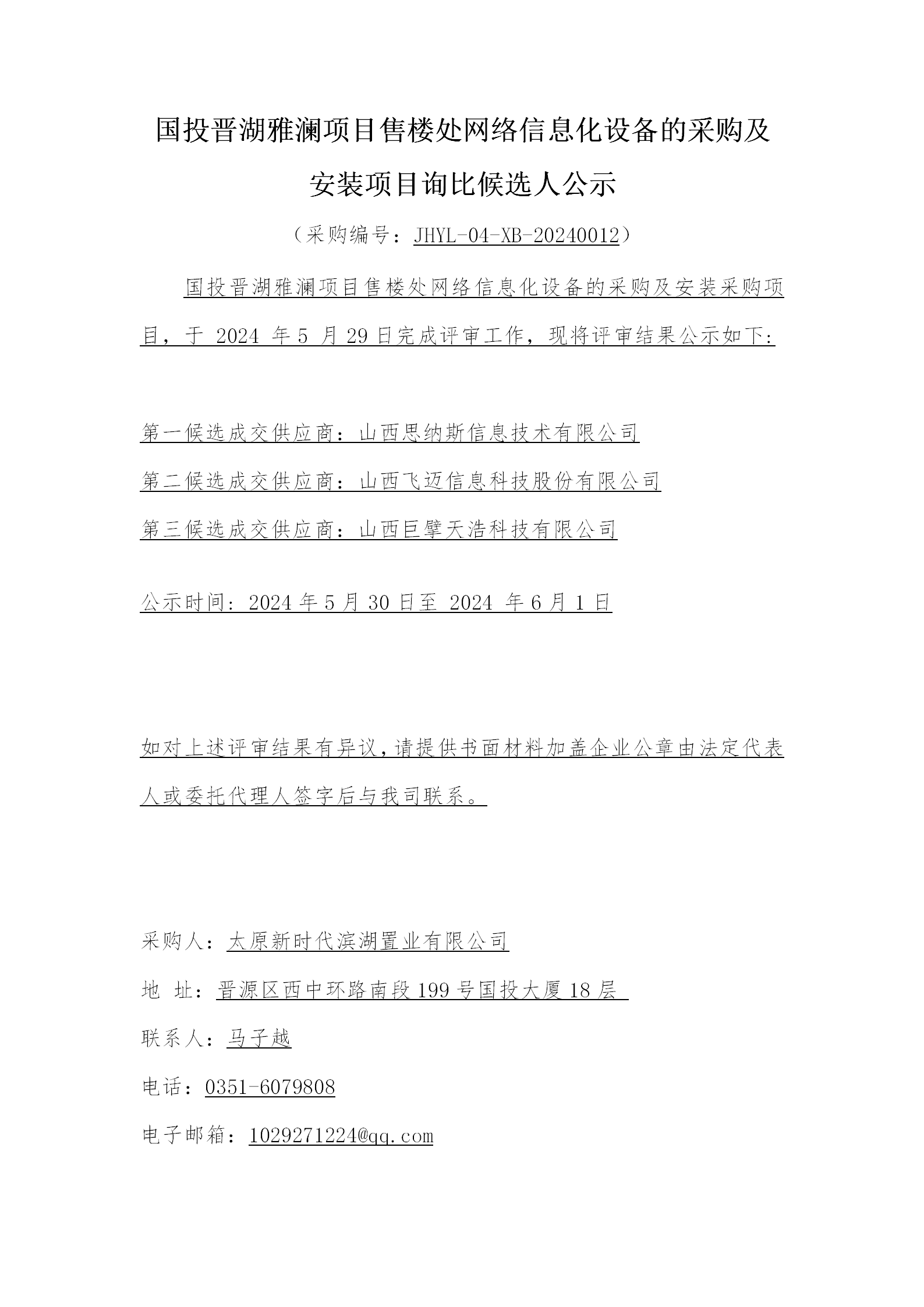 國投晉湖雅瀾項目售樓處網(wǎng)絡信息化設備的采購及安裝項目詢比候選人公示