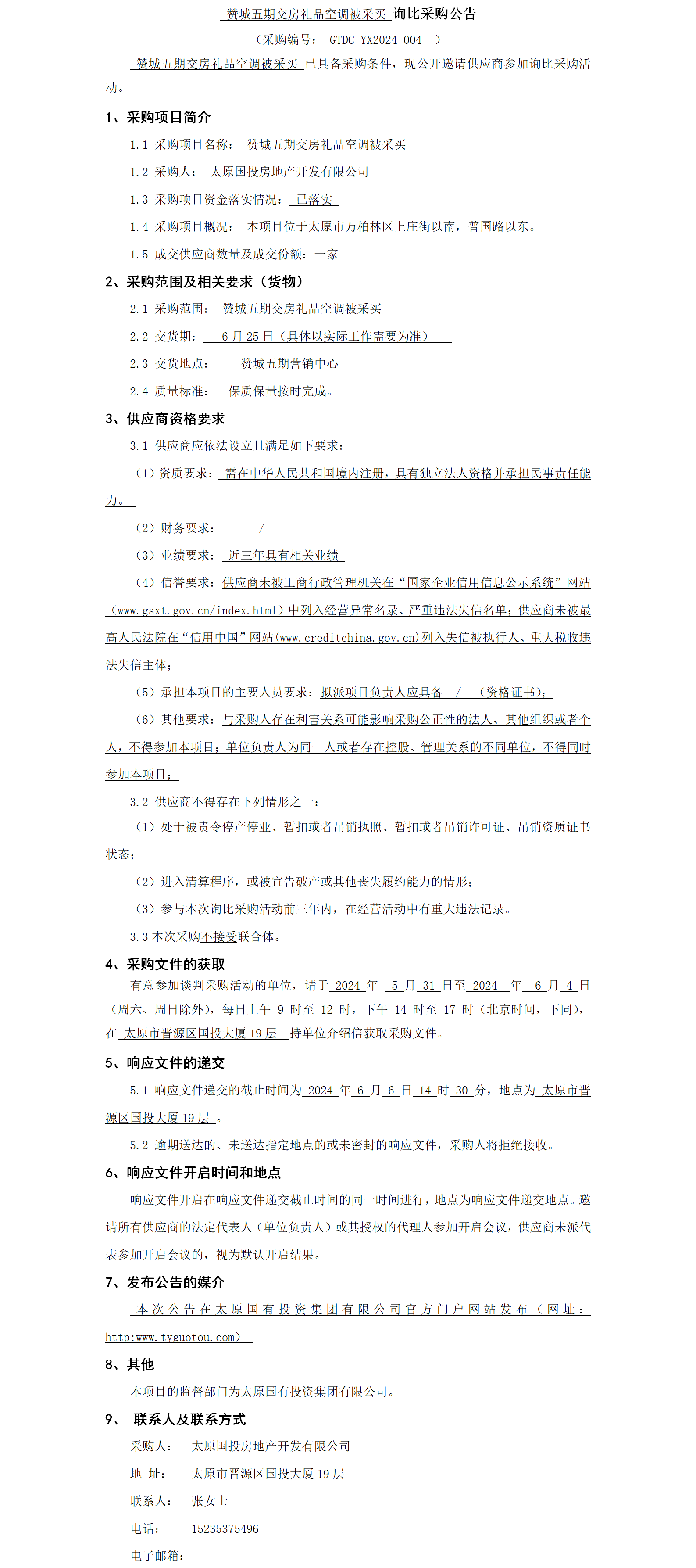 贊城五期交房禮品空調(diào)被采買詢比采購公告