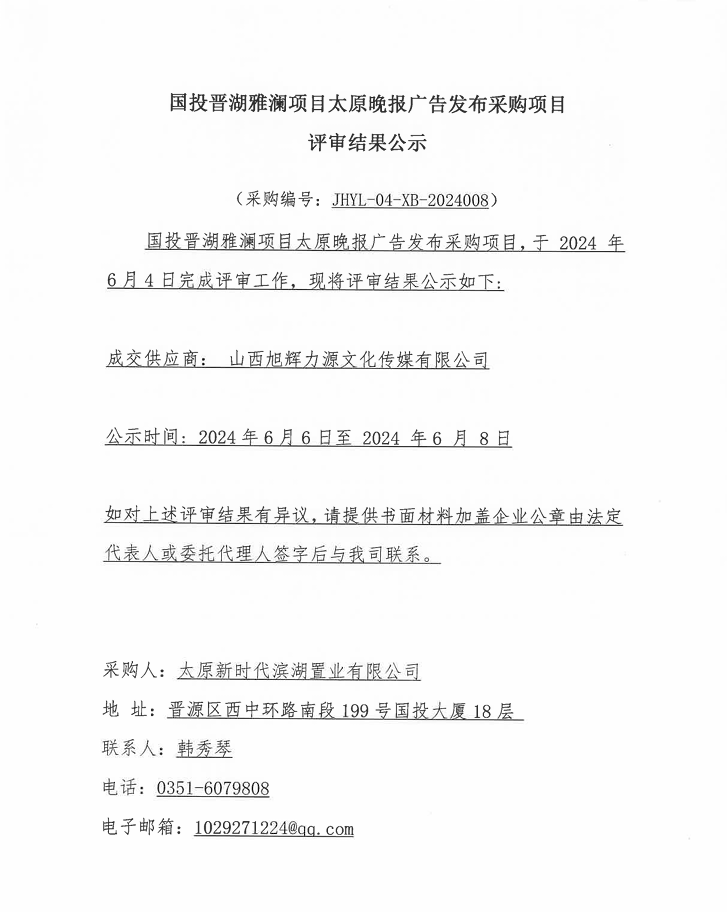國投晉湖雅瀾項(xiàng)目太原晚報(bào)廣告發(fā)布采購項(xiàng)目結(jié)果公示