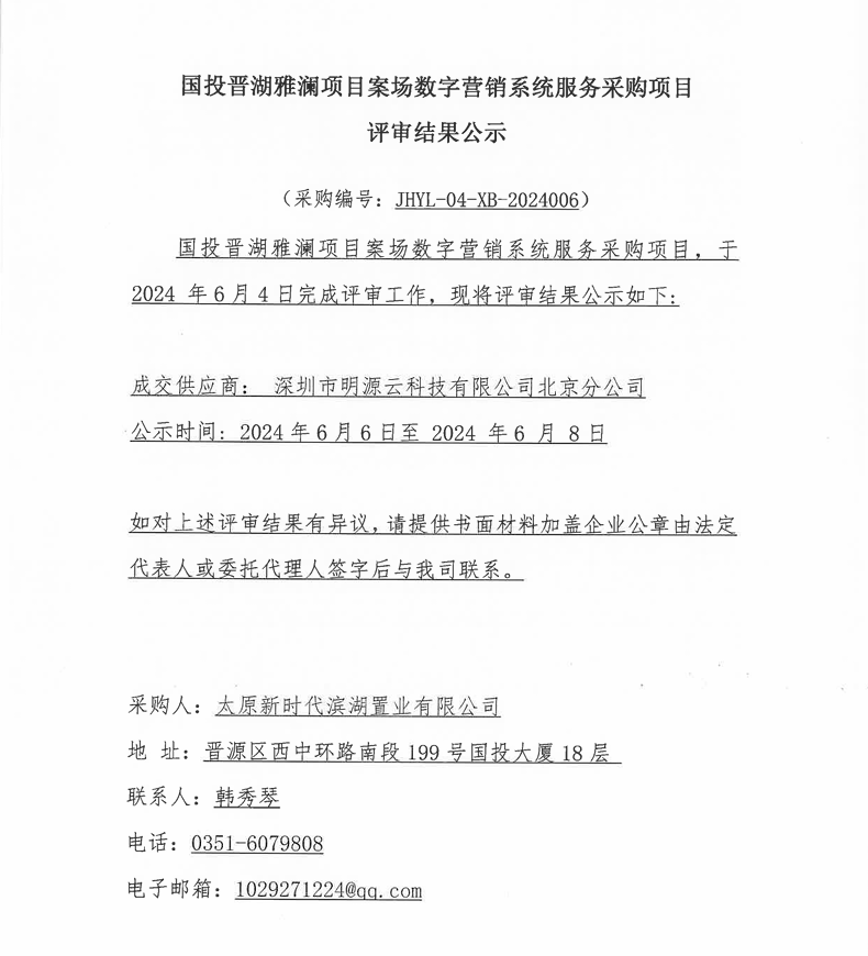 國投晉湖雅瀾項(xiàng)目案場數(shù)字營銷系統(tǒng)服務(wù)采購項(xiàng)目結(jié)果公示