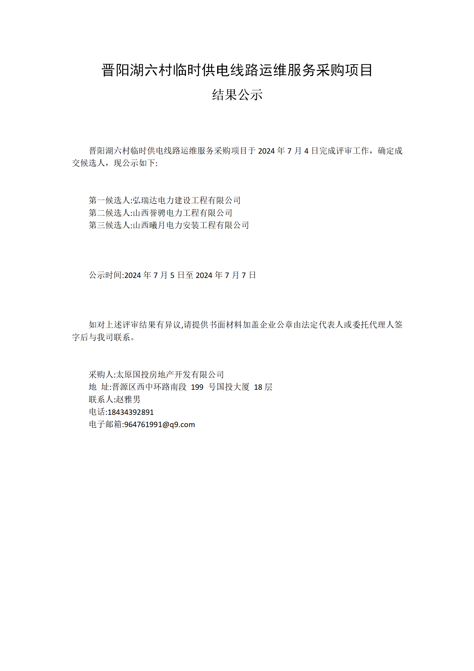 晉陽湖六村臨時供電線路運維服務采購項目結果公示