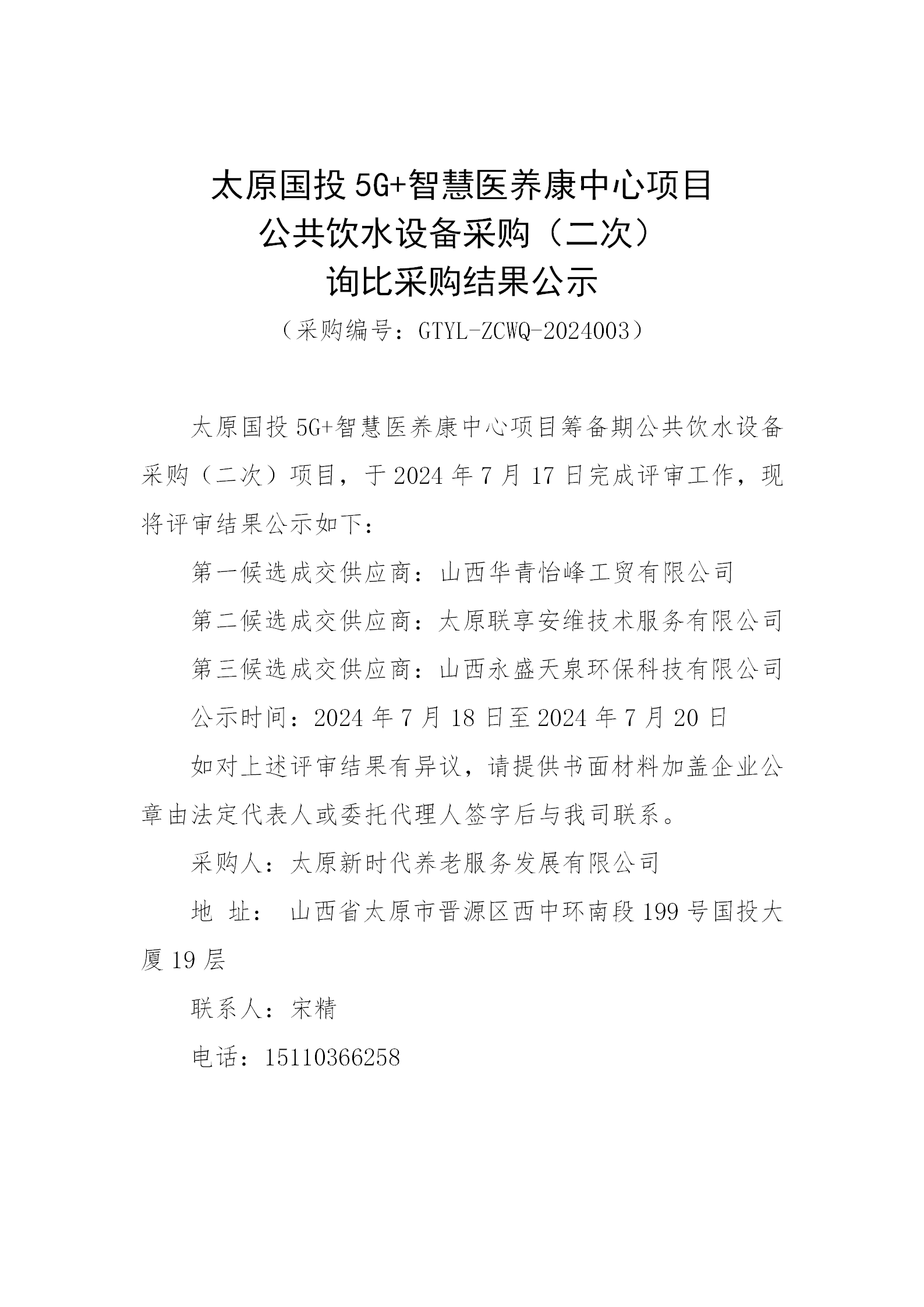 太原國投5G+智慧醫(yī)養(yǎng)康中心項目公共飲水設備采購(二次)詢比采購結(jié)果公示