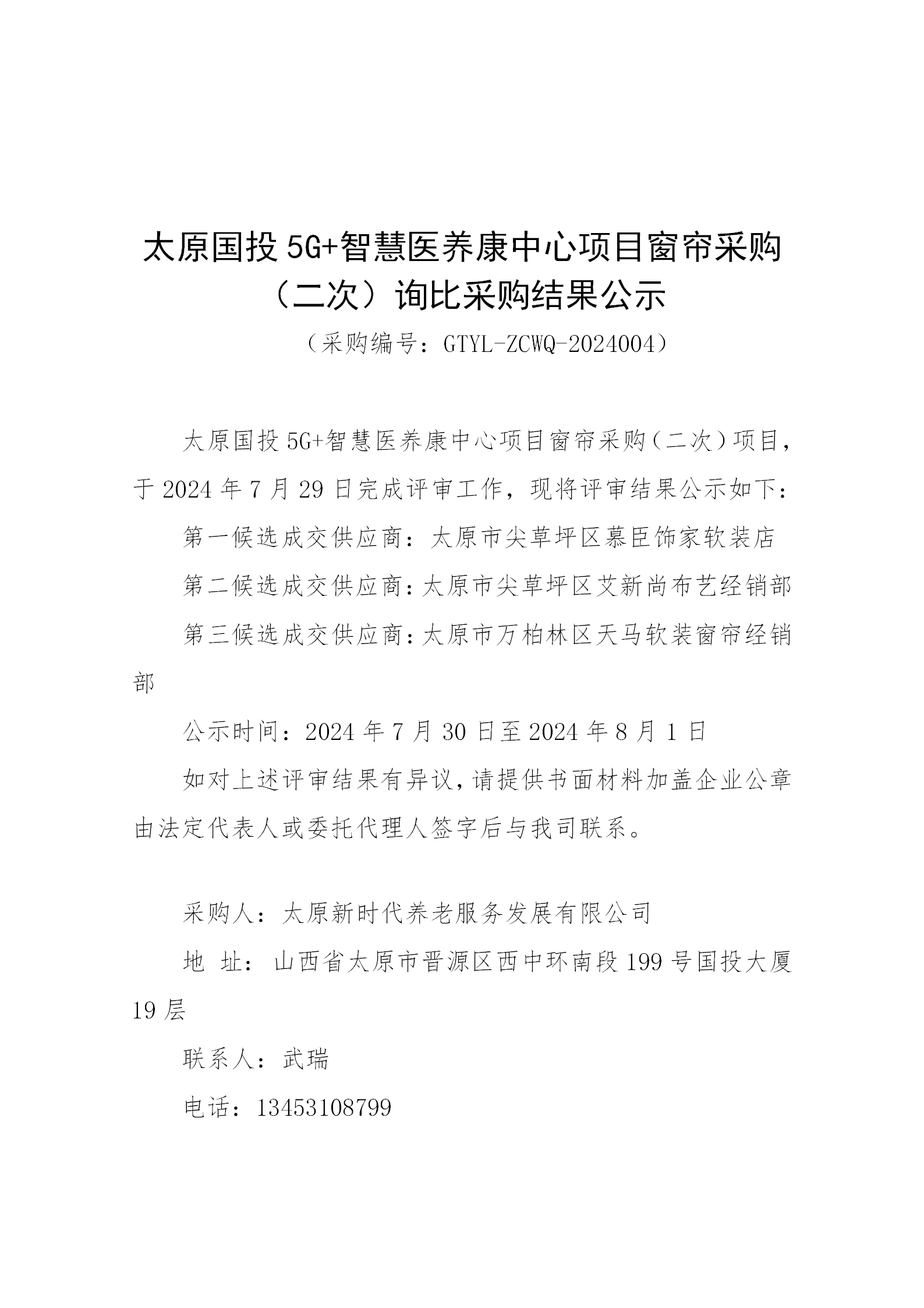 太原國投5G+智慧醫(yī)養(yǎng)康中心項(xiàng)目窗簾采購(二次)詢比采購結(jié)果公示