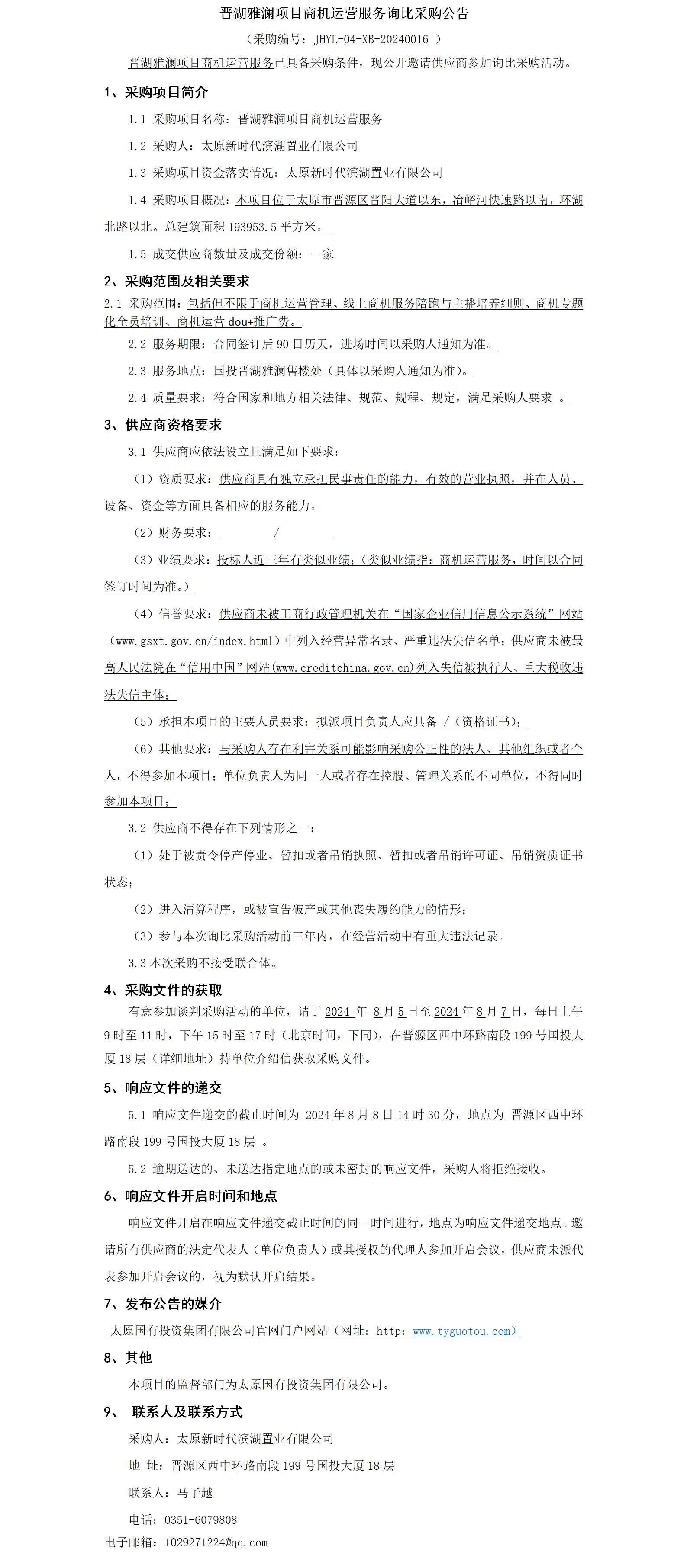 晉湖雅瀾項目商機運營服務(wù)詢比采購公告