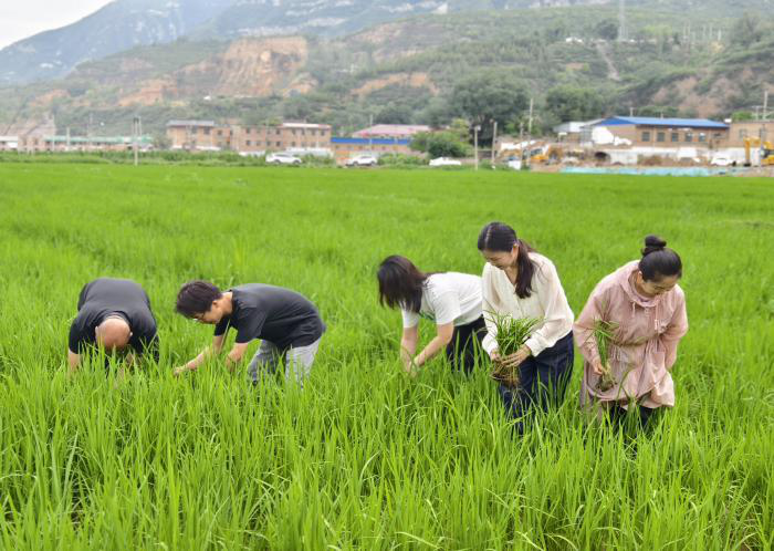 理論學(xué)習(xí)之后,活動進入了實踐環(huán)節(jié)。在專業(yè)人員的指導(dǎo)下,大家紛紛拿起農(nóng)具,走進稻田,親身體驗水稻種植的過程。雖然農(nóng)田泥濘,但大家的熱情絲毫不減,全體人員紛紛上陣,挽起褲腳,擼起袖子,彎著腰認(rèn)真地將秧苗一束束插在濕潤的泥土中,每一步都充滿了挑戰(zhàn)與樂趣。特殊的農(nóng)耕體驗,既是參與節(jié)約糧食活動的身體力行,也是將飯碗牢牢端在手里的生動實踐。