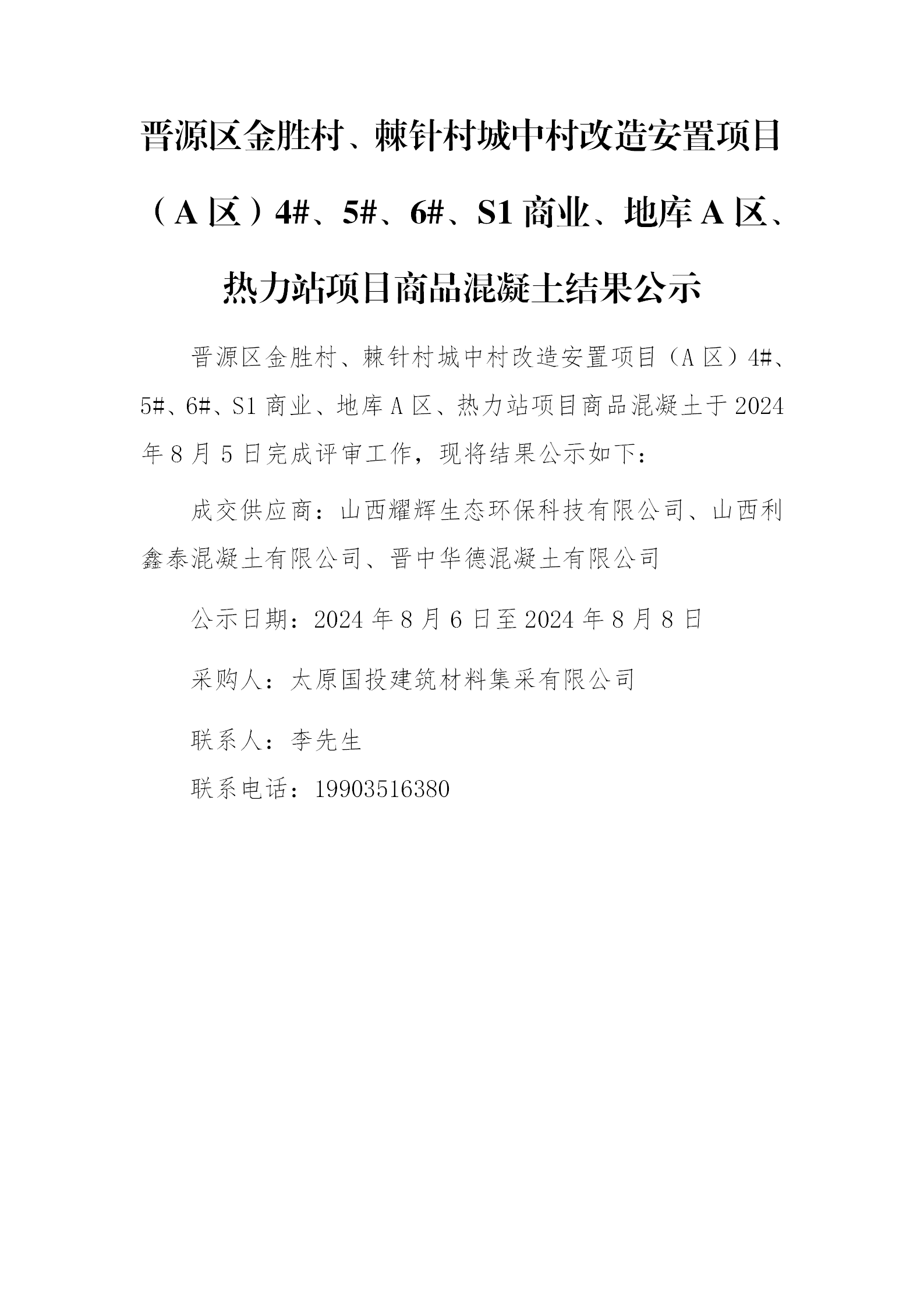 晉源區(qū)金勝村、棘針村城中村改造安置項(xiàng)目(A區(qū))4#、5#、6#、S1商業(yè)、地庫(kù)A區(qū)、熱力站項(xiàng)目商品混凝土結(jié)果公示